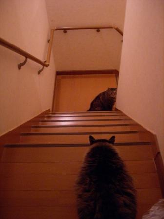 今さっきの出来事です~!チェリーがおもちゃで遊んでる音がしたので、写してあげようと部屋をでると、こんな光景に遭遇しました面白いので様子をみてるとチェリーが来てしばらく様子をみてるとモコは部屋に戻っていきチェリーとロンがこのままいました。チェリーとロンは階段の下が気になるらしくて、何を見てる?そうして2匹は下へ行ってしまいました・・・おもいっきり遊んでください、そして、爆睡してくださいな