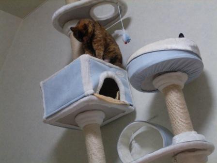チェリーはキャットタワーから顔だけだしてこちらを見るのが好きなようです。気づくと見てるときがあって・・・何をしたいんだい?ちょっとボケてしまいました。こちらははっきりと写ってます。怒ってるの?かわいい顔しようよ!