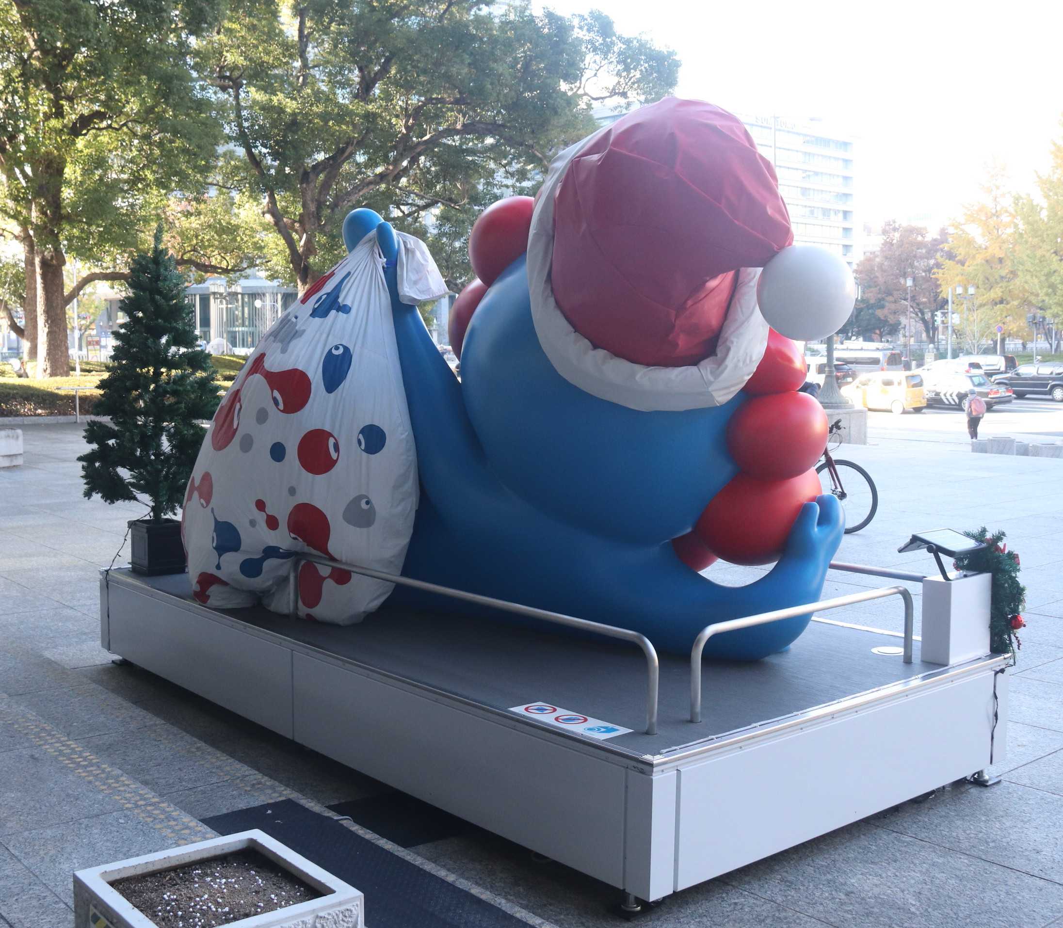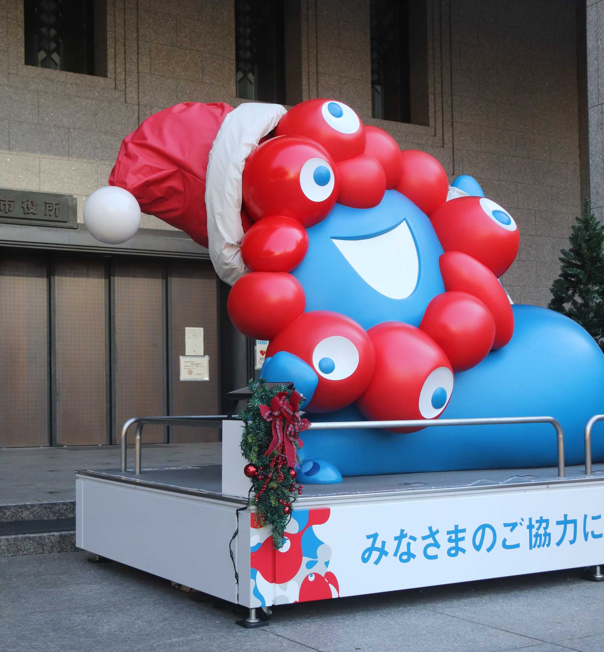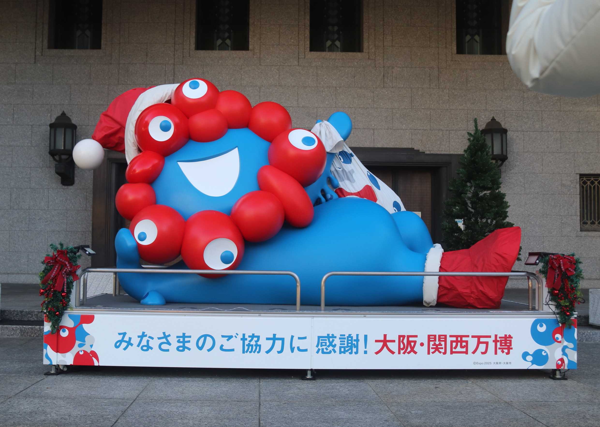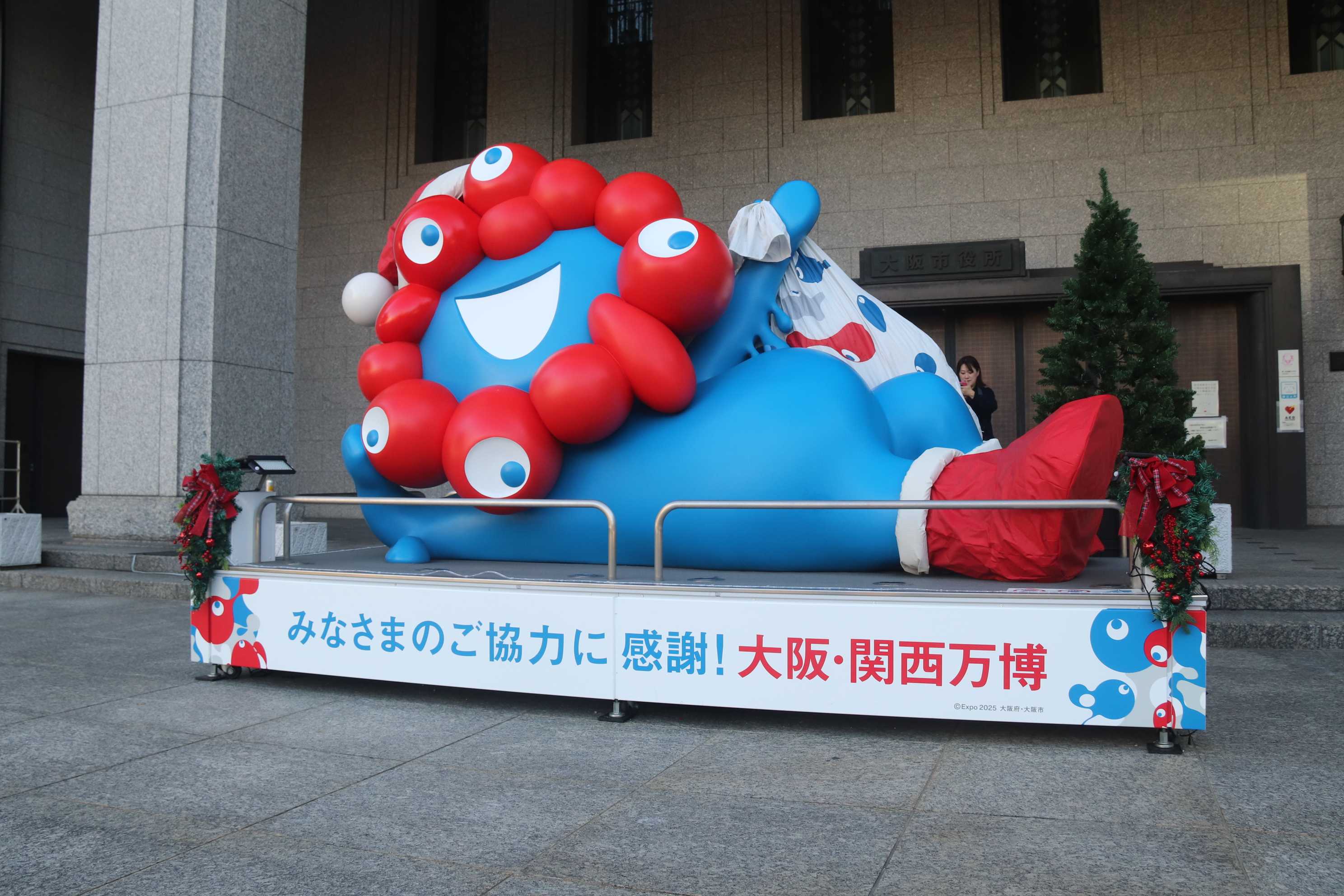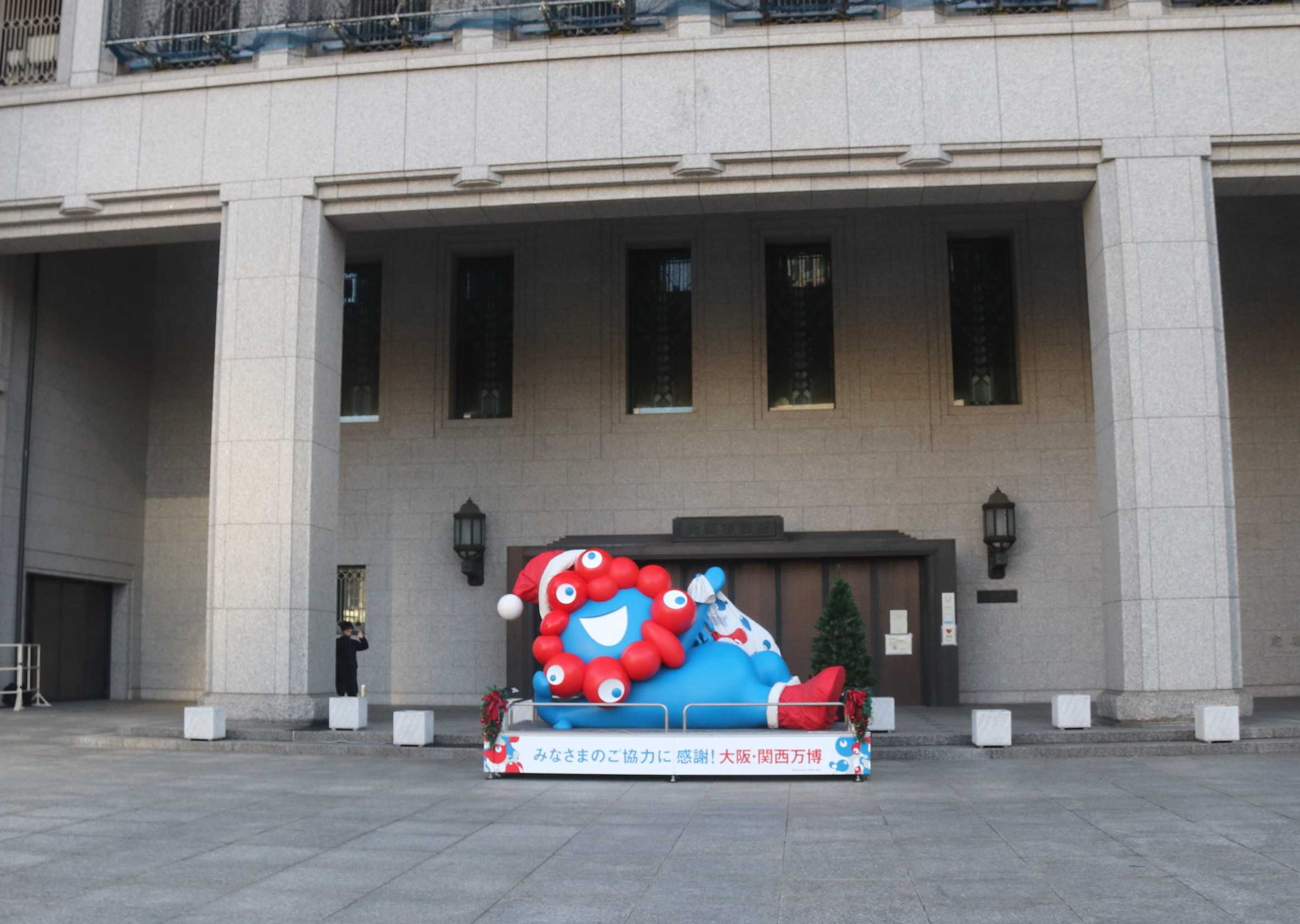 大阪市役所の正面玄関に設置されている『寝そべりミャクミャク』像が