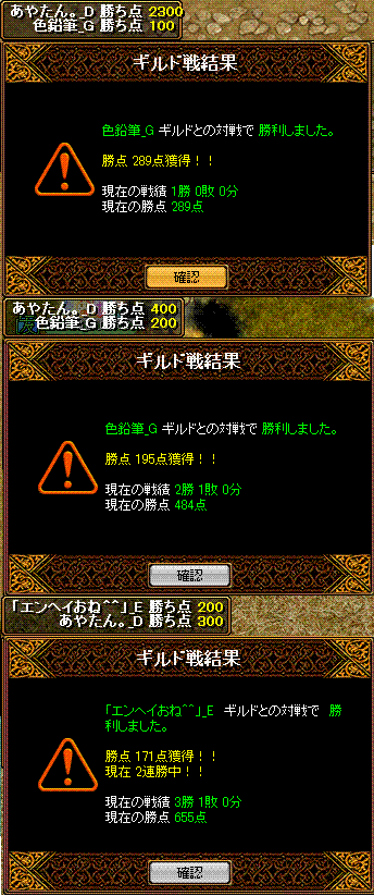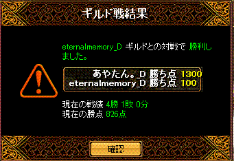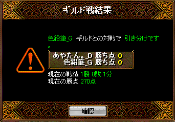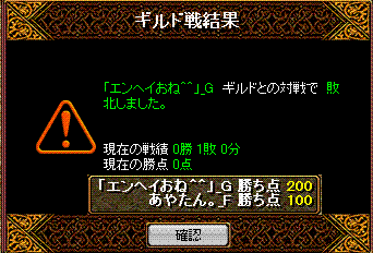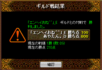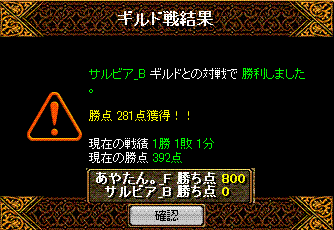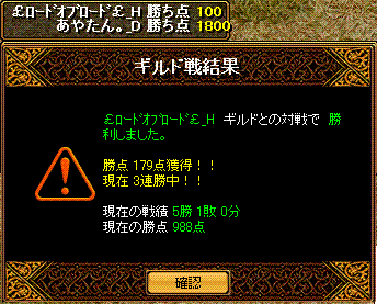 と対戦してきました 結果は!!無事勝利 場所は22:05分ナラダ二つ丘 禁止は五つ+烈火1名まで こちら集まりはbis1wiz2剣士2アチャ1天使1霊術1ネク魔1 そして秘密兵器が転送直後落ちなので合計その9名序盤ナラダでよくあるすれ違ってからの衝突で、押しつ押されつな展開 5分後ほどにこちらのwizがチャ氏する ちゃーだけに?!その後点を取り返せないなぁという感じからの2得点が連続して入る 鞄姫さまのぽろりを頂いたその後均衡状態が続き、回線切りへ 後半にお相手のBISさんを落とすことができ、崩した間に得点を重ねることが出来たという感じでしたチャ氏の部分は、比較的相手の攻撃力に削られる時も多かったので、チャット半分Gv半分という感じの死だったかな?そしてお相手のポロリからの得点でしたが、あれは点を取れない中での得点だったので、心理的にもこちら優勢へと運んだ部分が大きかったかな・・・あれがなければ勝敗がどうなってたか少し不安ですね・・・しかしあまり気にしないで頂きたいですね(__)対戦ありがとうございました!