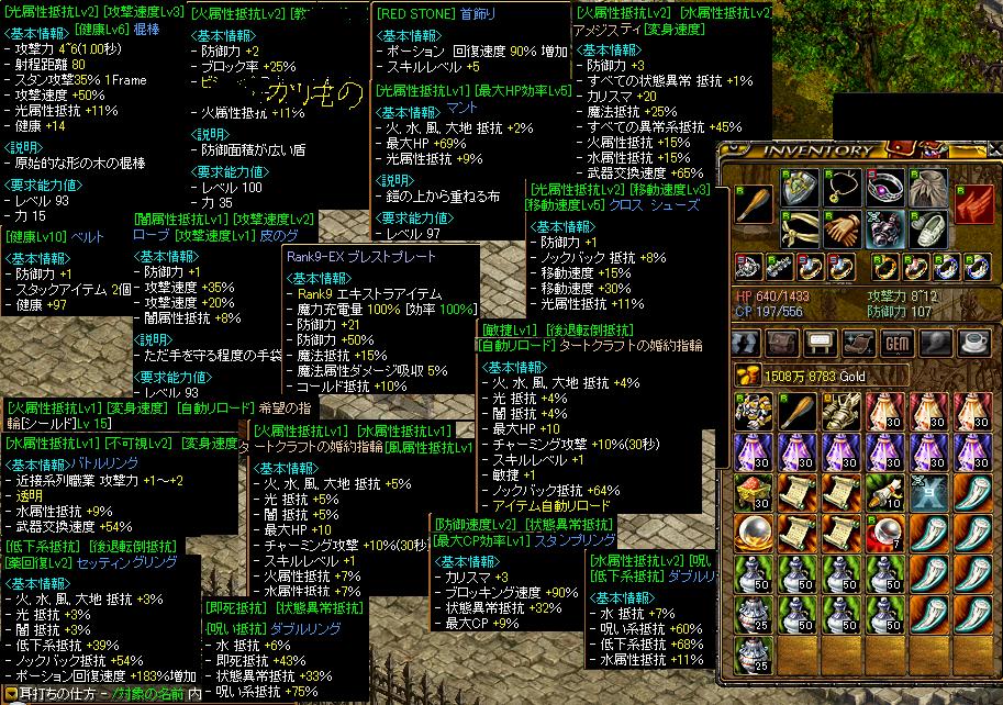 こんばんわ!ほっとするです今日はvs若葉さんとのgvを書きますこちらbis1 wiz4 姫1 剣士2 アチャ1 の9名 1名PTwiz1さんでした。お相手bis2 wiz1 剣士3 弓1 シフ武2→1 リトル1ネクロ1霊術1こちらは、万病投げによる異常系に対する異常耐久あちらは、霊術・武道・ネクロ・リトルさん活用しつつ超火力で押しまくるって感じでしたまず最初に、俺が初衝突で普通死(健康80)wwwwwwwwっとか言って復活、今日は固いはずなのに、これはおかしいとすぐに気付き、健康振ってさぁ俺は固いはずだ!っと念を入れていったらワームで死亡 多分タゲ2くらいで死→その後タゲ4くらい集まったせいだけど減りがやばかったそして、俺が死んでも味方はすごい死なずにそこで踏ん張ってて、すごいけどなんだかなーって眺めてました 俺が悪いwそしてもう1度復活。いったん逃げて、遠くで体制を立て直してた時に、「健康無振りですたー^;」とカミングアウトするとにーさんが「! ほっとする禅後、健康振ったぞ!もう1度倒してくれ!」っという叫び 俺は「(2Death目はちゃんと健康振ってたよ~!)」っという心の叫び。その後はまぁ、禅9 ○5 ○○3 ○3 ○2 ○1 ○1って感じのDeath数から、なんとなくわかると思います。結果は、2800:0で負けでした。実は今日は今までの火117水61光71闇41抵抗から、火96水112光87闇63にうpして挑んでました。ミラー混みなら、どのフィールドでもALL90というレベル。これに関していえば、魂切りによりミラー上昇が消えて、さらにマイナス40↑となる場面があるので完備とは言えないのですが、今回は抵抗ALL90がずっと続くGvだったっというのを前提に話させて下さい。多分黄ダメメインGならこれですごい硬さを発揮できるけど、若葉のような白ダメメインGだと、その効果は比較的薄いというか、まず土俵が違ったみたいだった。っというか、いちお白ダメだけでも脅威だと経験上わかってたのに、属抵抗こんな高いの初めてだったからそれによるダメ軽減に過剰な期待を寄せていた;まぁ、それ差し引いても、いちお今日は過去最高の硬さを俺は持っていたはずなんだけど、それが一切アレなアレでして・・・・まじで、ぼっこにされた。属性抵抗と、硬さというよりは、HP量そして健康なんだなーっと再認識させられました。とりま、今日の装備と鞄の中身は通用しなかったので、それを晒したいと思います爪はサンタイベントの時のやつです これを使うと、CP効率100%がまるで心の中の装備のように1箇所増加します実際に表すとこんな感じ冗談抜きで、もしそういう装備枠があってそこにCP効率100%をつけれるのだとしたら、すごくいいと思います。欠点は、鞄の枠を多く取ることと、ブレイズで消されるものであるということ。CP835とかになるのですが、ブレイズ食らうと、表記そのままですがフルポ飲んでも556から減り始めますブレイズ多発・少しの土壇場・予想外の展開に弱いアイディアなのはわかってたのに、今日はそれがおもいっきり出された感じ。まぁこの物資で、今日はフルヒフルチャ20分で切れた。ただ、フルヒは2回連続で飲んだり、アオポも限界まで消費せずにどんどん使ってった気がするし、まぁPSもダメなんですね・・・したらばで僕の名前出ましたが、エレメはここ最近33前後に推移してました そんな高くないですまぁこんなPSのBISです!最後!!詳細は、HP半分以下になった時、ディムさんにRS首飾りプレゼント・死んだら、殺してくれた人に1億プレゼントです!!