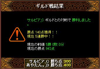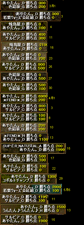 突然申し訳ありません 溜まってた戦績も一緒に!本日はこちら集まりbis1天使1wiz1剣士1霊術1武道1の6名 お相手は1PT半くらいだったのかな?コールで呼ばれない人数を見た感じだと 禁止は5禁+烈火1まででした内容はこちらの集まりがあまりよろしくなく、お相手の烈火や多数のタゲが集まった時の高火力に対応するのが難しくって天使さんのコルに多くを救ってもらったって感じですかね・・・後は、サルビアさんが陽鯖になって、それと金鯖による100制限キャラ作りの敷居が低くなり新規さんが参入しておられたのかな~っという感じで、柔らかい人が見受けられましたそれでも、タゲが合った時等の火力が凄まじく、自分も一度昇天してしまいました 1.5秒くらいで死んだかな!!魂斬りもされてた時のようなのでやはり注意が必要のよう。という感じで200:700で勝ちでしたコーリングは、ワーム・真空・そして味方のHPが危険な時にするものです そしてそういったコルの後は、相手のど真ん中や目の前にパーティーを戻すってゆー仕事が、死ぬ恐れがさほどない天使にはあると思う特に今回の場合、あやたん。は適切な一名に烈火されるだけでこちらの戦力が大幅に削れるという状況でもあって、それを防ぐ為にすぐさま混戦状態からスタートするってゆー始りが個人的にはほしかったかなまぁ天使は、にわかでやられるのが個人的には一番嫌いだけど、後半は俺的好きなコーリングが増えてたので、成長してるなーって感じでよかったです おつかれ!!