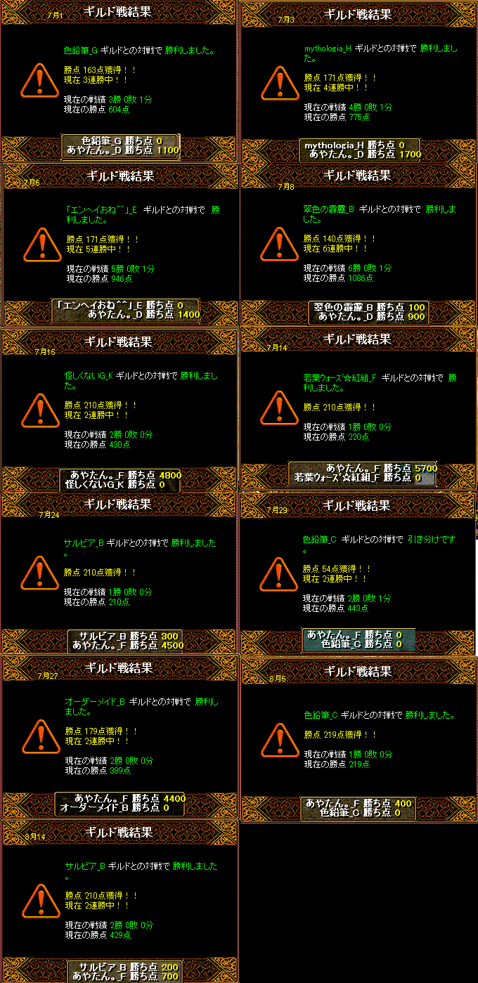 8月21日Gvしました 22:33分場所は二つ丘、禁止は久しぶりのGvだった為、5禁+烈火1を希望 結果は!割と完敗でしたこちらの集まりは、bis1wiz1剣士2霊術1ネク魔1姫1の7名お相手は、bis天3?wiz3剣士2アチャ1ランサ1武道2リトル1ネク魔2?霊術2の16~17人?程 集まりがよかったっぽい内容は、こちらが姫の万病投げで異常系抵抗力をあげ、自分のbisはシルフラで耐久度upそうしてそれぞれが死なないように立ち回り、またワンチャン狙おうと頑張ってましたが、お相手の烈火や腕切り、コールで決定打を与えられず、また、2回ほどどうしようもなく決定打を与えられ霊術さんとwizさんが1回ずつ死んだっていう感じでした!自分もシルフラつけてなかったら死んでた気がするメンバーそのものは実際、bis1wiz1は最低限の前提で、禁止の烈火1までいう部分をこちらのネク魔1でおさえてもらい、火力2はワンちゃんを生み出す可能性を残し霊術姫がそれぞれの要素を持ち上げてくれるってゆー感じでこの構成そのものは割といい感じだったと思うんですが、やはり相手の多様な職に手がとどかなかった感じですねただ自分はBISとしての手応えを感じることが出来ました 鞄の中身が完璧になったそして一応、あやたん。は引き分けを4~5回ほど挟みますが、勝利が38回ほど続いたっぽいです 20数回だと思ってたけど積み重ねってすごいぬまっあやたんにしては上出来だったと思うwただ、この記録にこだわりを持ってた方には申し訳ない。お疲れ様でした!!