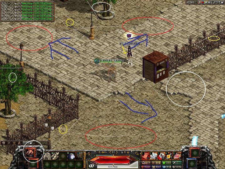 どうも!横長の画像で見にくいですが画像を張り、それを解説する っという形で三つほどいきますごめんなさい精霊の翼の射程800ではなく600でした!!!!↓の文章の、翼射程800を600に、しかし弓のメインウェポンであるIFの射程は800のまま でお願いします。画面から弓が消える位置ですね・・・はいざこおつーみたいな画像編集ですみません・天使の周りの白い線は、射程800を表す線です。アチャの弓で最長の射程を誇る、IF弓と同等の範囲=アチャの最長攻撃範囲・隣に立っているテレポーターを、剣士やアチャ等の火力として置いた場合、障害物の横から伸びてる線が、その火力が攻撃をし続けられる範囲か否かのぎりぎりのライン。・白などの輪は、天使がその位置に立ってコルした場合、ほぼ確実に火力の攻撃を遮断出来る位置・黄色い輪は、どうしても障害物からメンバーがはみ出てしまう・この場合約20~30%のメンバーしか相手の攻撃を遮断することが出来ない位置・赤い丸は、天使の位置からですが、障害物なしで、アチャの800射程の攻撃を切れるか否かの、ぎりぎりを示しますそして青い矢印は、そっちに戦場を移動させた方がいいという意味の矢印です。上記の戦場では、敵味方共に「戦いにくい」と思います。自分的に天使は、まずこのような視点を持ちながら、動くものだと思う次は、こちら天使がコルというスキルで出来る、「ゲームメイキング」について語りたいと思います。「ゲームの展開を作る」っという意味の言葉が自分はわからず、今回はこう言わせて頂きますこの場所は、なんか適当にいい場所ないかなーと探しまわってたら到達した、廃墟スバイン要塞の中にある監獄という狩り場です。プレイヤーがBISになってますが、天使として見て下さいまず、(1)が最初の戦場とします。赤い丸が敵、肌色が味方で、なんか微妙な位置で混戦していますそこで自分は(2)に移動してメンバーをコルします。メンバーは、背水の陣状態で、お相手は包囲網を敷いて追いたてるような形になります次に、天使は黄色い線を辿って(3)まで移動します。敵味方側からしっかりと見えるこの位置で、俺はここにすたんばってるぞーという自己あっぴるをします味方は必死に戦っていますが、基本的に逃げ場がない=瀕死になってもそこから息を吹き返すことはほぼ出来ない→このタイミングで、(3)にてコルをしますそうなると、相手側は赤いラインを通り(4)に来ると思います。天使は、黄色い線を移動し、(4)にてメンバーをコルします 相手は約1400の距離・こちらは約800の距離を移動して到達を出来ますこちら側はまとまった状態で、相手側は(4)へと到達した者から順に衝突を開始 これが、今回の行動の一つ一つにより作り出すことの出来た、目的の展開ですこの展開での、「こちら側の有利」っというものは、昨今のGv経験者なら誰しもがわかることだと思います。この展開の、一つ一つの詳細な意味を語っていくと、まず、背水の陣・それを攻め立てる立場・と敵味方を置いたのは、「定点的な、妙なばらけ方をしない戦場に位置し、予想外の展開を回避する。なおかつ相手側が攻め側であるという状況を作り出し、攻め という印象を与える」次に、味方が力及ばず死にかけた時に救いコルをするというのは、まぁ当たり前の仕事ではあるのですが「案の定あと少しの所でコルされた。とどめをあと少しでさせたのに。」っというイメージが相手には浮かび、相手の心理的に、それまでの勢いで、こちらを追い掛け、攻めに来る っという確率をあげる部分でもありますそして案の定、お相手が細長い通路を通り、しかも距離も長いので少しばらけた状態でやってきたその先端に、こちらのフルメンツが衝突・始動は圧倒的有利な展開からスタート っという形に持ってくる(守りから、攻めに転ずる というゲームメイキング)っという感じです。このフィールドを見た時の、ちょっと都合のいい、味方が有利になる展開・戦略の一例をあげてみた感じです戦場でメンバーが「戦いやすい」形で最も代表的なのが、> これです 不等号の> これとがった方を味方(天使のコル位置) 広がる方を相手側とした場合で、上の画像にそれを書き足してみるとこんな感じです 不等号の広がった部分に、○を描いてそこに敵が収まるというイメージをして頂ければ、こちら側が戦いやすい位置にいるんじゃないかなぁと思えるかと思いますこんな感じでした。あくまでこれは、ほんの基礎的な一例として、捉えて下さいただ、天使の存在はやっぱり大きいですよね。しかし、もろ刃の剣でもありますよね。よって頑張って頂きたいですまぁ以上、自分なりの天使の視点 を語らせていただきましたおやすみ