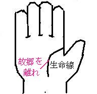 お早うございます。手相太郎へご訪問いただき有難うございます。昨日、大阪のYさんから鑑定料金とは別に感謝料をいただきました。私にとっては鑑定料で充分なのですが、まるで感謝状をいただいたように嬉しかったです。今日は、手相と生まれ故郷の関係について考えます。生まれ故郷を離れて成功する手相(仕事や恋愛や結婚)このように生命線から発生した線が有る方は生まれ故郷から離れて、仕事や恋愛や結婚に成功する可能性を持っていることを意味しているのです。生まれ故郷を離れて仕事をされている方は多いと思います。しかし、何かに不安をお持ちの方も居ると思います。この様な線が有りましたら、私には成功する素質があると思っても大丈夫だと思います。故郷に帰りたいとお考えの方はこの手相図は、故郷を離れた地で、金運を持ち、仕事運を持ち、結婚運を持つことを意味します。金運線と結婚線が交差、金運線と仕事線の交差、金運線と故郷を離れてが繋がる、何時かは故郷に帰りたいとお考えの方は金運線が生命線に向かって、どこまで伸びていくかによって故郷に帰った方が良いのか?このまま離れた地で生活するのが良いのか?金運線の伸び方によって決まるのです。自分の手相の意味を知ることには少しの勇気が必要です。その勇気が自分の可能性(仕事の成功、幸せな結婚)を知ることに繋がるのです。