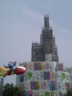 この日がどんなに待ち遠しかったかわかりません♪♪ディズニーランドへ行って来ました(^-^)v今日は何かあったのでしょうか??とにかく人が多かったです。そのせいもあり、友達とのんびり過ごしました。私はあの雰囲気の中にいられるだけで大満足なので、アトラクションもそんなに気にせず、アンバサダーホテルの方をぶらぶらしてみたり、アイス食べたり、クリスタルパレスのバイキングのお食事を楽しんだりしました。クリスタルパレスはテラスの席で、ほどよい風に吹かれながらパレードをしっかり見ることが出来ました(^^)シンデレラ城がただいま改装中で、下の写真の様に足場に覆われてしまっていました。いつからリニューアルされて、シンデレラ城ミステリーツアーの後には一体何が出来るのか楽しみですo(^-^)o