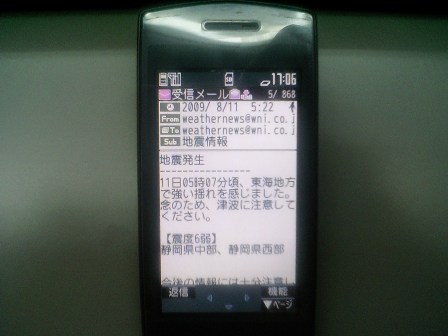 昨夜からあまり体調が思わしくなかったため9時前には寝てしまっていて今朝は5時前に起床大雨も台風も思ったほどではなかったのでホッとしましたが地震にはびっくり日曜日の夜に続いてだったので地震が起こると携帯にメールが来るように(仕事上)設定しているんですが震度を見てまたびっくり(今回は県内震度3のため出動はなし)通常は発生して2・3分で来るんですがタイムラグがありすぎでそれだけ情報収集に時間がかかったんでしょうか私も震度5は体験したことありますが(本当に立ってられないです 物は落ち放題です)震度6となるとどんな状態なのか・・・被害にあわれた方にはお見舞い申し上げます高速道路も路肩崩壊で通行止め、一日も早い復旧を願います