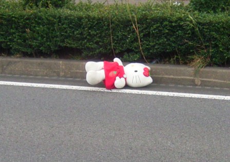 言わずとしれた、犬のおまわりさんの歌いだしまいごのまいごの こねこちゃんあなたのおうちは どこですかおうちをきいても わからないなまえをきいても わからないニャンニャン ニャニャーンニャンニャン ニャニャーンないてばかりいる こねこちゃんいぬのおまわりさん こまってしまってワンワンワンワーン ワンワンワンワーン 迷子の子猫というのはこの子 道路にぽつんと横たわっていました彼女とけんかしていやになったのかわざわざ道路の真ん中に置いていく人はいないだろうし引越し途中、トラックの荷台から落ちたのかなぁ 迷子のお知らせをいたします赤い洋服を着た身長りんご5個分(結構でかいぞ~)の34歳(ハローキティ 1974年11月1日生まれ えっ、うそ~)の子猫をお預かりしていますお心当たりのある方はこのブログまでご連絡ください ちなみに彼女は今会社の車の中で大切に保管されています