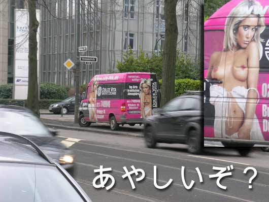 ドイツの街がおいらたち日本人にきれいに見えるのは、日本よりも看板なんかを厳重に規制してるからだよ。そこで、看板をだして宣伝したい店は、宣伝画像なんかを描いた車両↓を、駐車スペースに置いて看板がわりにしてる。これなら、あくまで、車を合法的に道路に駐車してるってことで、おとがめなし!考えたね、法律の抜け穴だね。画像↑の矢印は、日曜大工の大型専門店の広告なんだ。ところが、その後ろの建物は、壁全体に派手な色のペンキで塗りたくって、車両の広告塔をあざ笑ってる!そう、ざまぁ~みろ!ってことだよ。笑建物全体が巨大な看板みたいになってるのに、でも、これは、あくまで、巨大ないたずらがきなんだ。だから、市もどうすることもできないのさ。↑ 風俗店inドイツ。女性,今日はパスね!( >< )Dusseldorf2010/02/27日記過去日記はCalendar.の日付をクリック!│