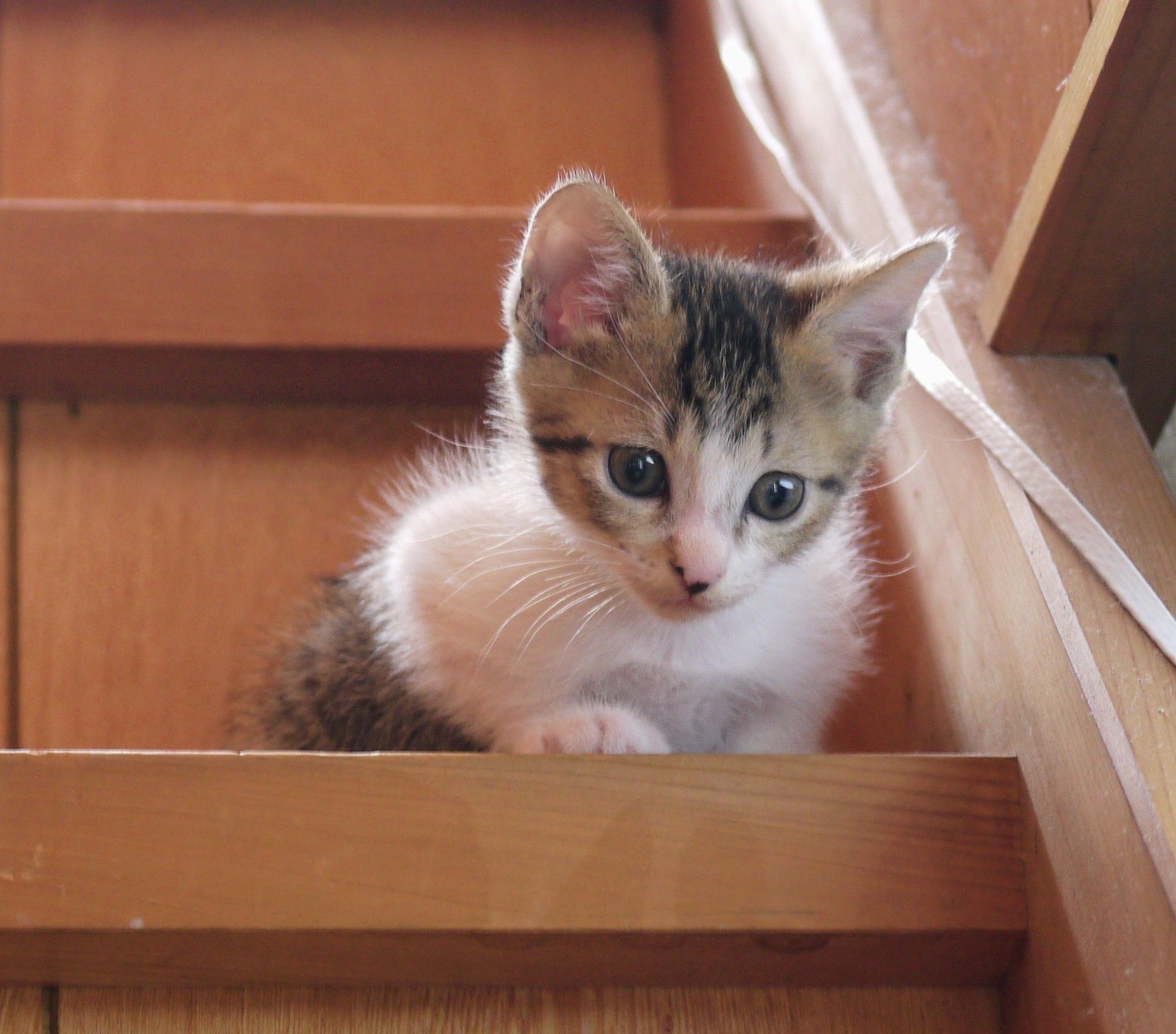 チロが階段見上げて、ぴすぴす言う。