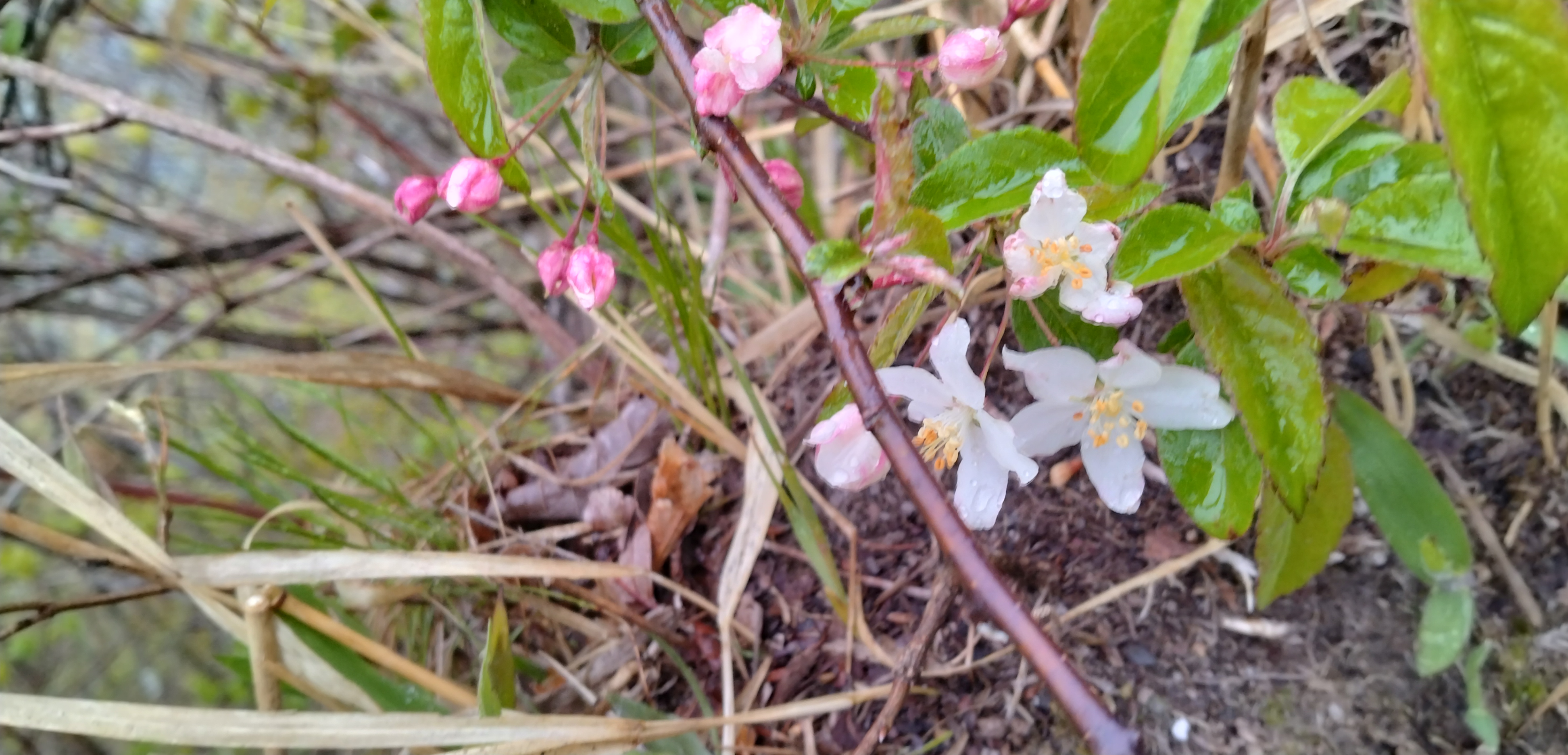 ミツバツツジが6分咲き?ズミも咲き始めた。