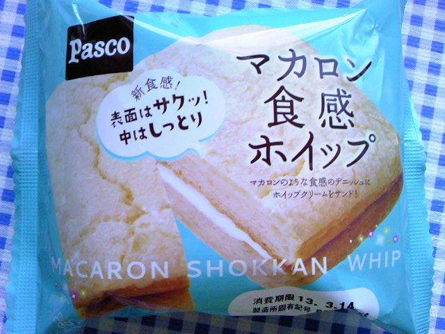 本日の朝食に食べた菓子パンです Pasco マカロン食感ホイップ 朝から驚きの超高カロ566Kcalでございます この水色の綺麗なパッケージについ手がのび、カロリー表示など見ずに買ってしまった。。。(まぁ毎日じゃないし、いいか~?) で、外袋から中身が見えなかったので、マカロン食感ってどうなってるの~という思いも。 こんなでしたよ そんなに目新しい感もなく、よくありがちなパイ系の外側にホイップクリームがサンドされておりました。 けして不味くはないですが、スイーツ感を期待するとアウトですね。パンですから~。 菓子パンとしては私的普通です。1度食べまして満足でございます。 それ以前に私はマカロン食感の比較としてのマカロン自体がイマイチよくわかってないのですみませんm(_ _)m 一度は美味しいと言われているお店のマカロンを味わってみねばと思いつつ、今だ実現できておりませんので。。。。 ただきっとマカロン食感ではないんじゃやないかと ブロ友の皆さんが紹介されてた物件私も遅ればせながら食べましてよ