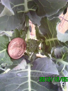 寒さでここのところ、野菜が高いですね~ トウ立ちしたのか?と思っていた茎ブロッコリーですが、 12月のはじめに頂花蕾が! 最初の蕾を10円玉くらいになったら早めに採ると、その後脇から次々伸びてくるらしいのですが、 どう~も10円玉まで成長しそうな気配もないので、早々に蕾採っちゃいました 頂花蕾を採ってから1ヶ月以上、まだ成長するのか、最終形なのかは不明ですが、現在にいたります。 せっかくなので、収穫とは言えませんが 念願の「茎ブロッコリーとコンビーフ」の炒め物を作りましたよ! 冷凍ブロッコリーの中にかくれて3本混ざっておりますわ 本来の正しい姿はいとゆふさんのブログで御覧くださいね 先日食べたおやつで~す(cupシュー カスタード&チョコ)