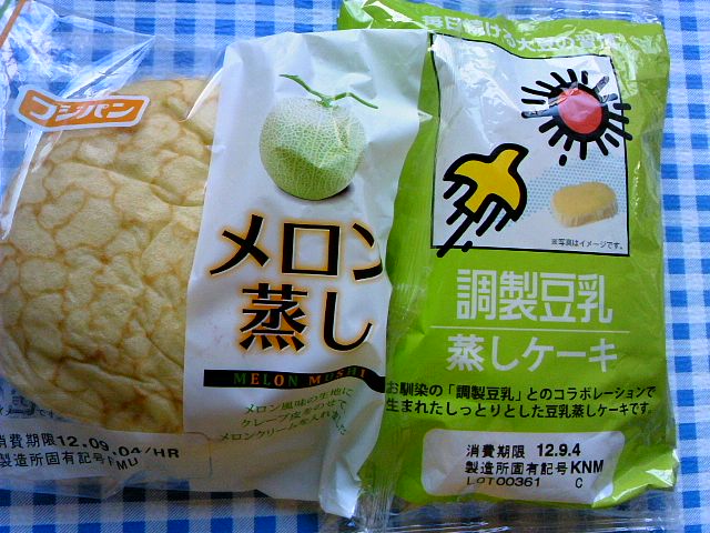 先日、スパーのパンコーナーに秋の新作を見に行きましたら、ありましたありました かめばーちゃんさんが紹介されていた「マロンチョコチップメロンパン」も「香るメープルくるみメロンパン」も 同じ商品も、たくさ~ん数が置いてあったので、まだ後日でも大丈夫だなと。。。 なんだかその日は蒸しパンの気分でしたので、こちらを買って食べましたよ。 フジパン「メロン蒸し」 & 第一製パン「調整豆乳蒸しケーキ」 「メロン蒸し」は、メロン風味の生地にクレープ皮をのせあり、メロンクリームが中に入ってます。 「調整豆乳蒸しケーキ」は調整豆乳とのコラボ。しっとり系蒸しケーキです。 クレープ皮が美味しそうに見え、「メロン蒸し」の方を期待して買ってみたのですが、 フジパンさんは中身クリームのうっすら、ちょっぴりがお得意なのか、クレープ皮は良しとしてもクリーム少な過ぎないかい 生地自体もきめが少し粗いかな。 左が「調整豆乳蒸しケーキ」右が「「メロン蒸し」 「調整豆乳蒸しケーキ」は中は何も入ってませんが、生地自体がきめ細かく、ぎっしっり詰まっていて、しかもしっとり柔らか リピするなら「調整豆乳蒸しケーキ」の方かなぁ しかしkcalの方は、調整豆乳なら健康に良さそう?との私の勝手なイメージとは裏腹に、 「メロン蒸し」293kcal < 「調整豆乳蒸しケーキ」390kcalでありました。 原材料を見れば、「調整豆乳蒸しケーキ」の方にだけマーガリンの文字が。。。。 やはり高カロリー好きな私でありました