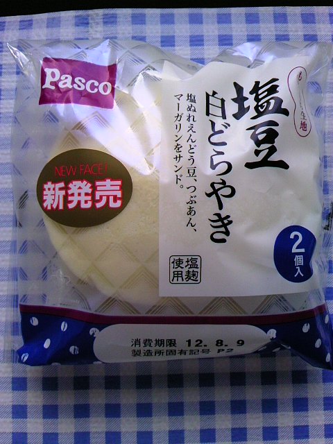 本日も菓子パンで~す。 先日、塩キャラメルクリームパンを買った時、次は「あれ!」と決めていた品です Pascoさん 「塩豆 白どらやき」 白どらやきの皮はもちもち生地で、「うさぎのほっぺ」と同じ生地のように思います。 塩豆はぬれえんどう豆で、つぶ餡と合わさっています。 マーガリンがサンドされている意味があまりよくわかりませんが 2個入りで1個が227kcalです。 私的には「塩キャラメルクリームパン」の方が好きですね もう一つは ヤマザキさん「クッキーメロンパン」 これは底部分にクッキー生地を敷いてありました。 一般的なメロンパン。ふつ~うに美味しかったです。 こちらは驚異の548kcal~ バター風味のせいですかね。。。。 試し押しはひっくりかえしてね