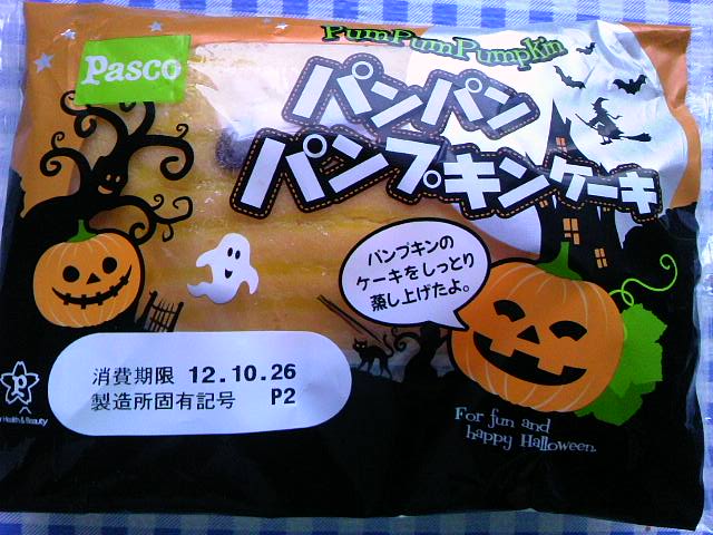 いつも気まぐれな更新にお付合いいただき、ありがとうございます Pasco パンパン パンプキンケーキ Pascoさん、ハロウィン関連の菓子パンですね。 お値引きシールが貼ってあったので買ってみました ケーキとありますが、ようは蒸しパン(ケーキ)です。 かぼちゃ色でキレイでありますが、あまりカボチャの味は感じられないような。。。。? でも、しっとりしていてとっても食べやすくて美味しいです。 かぼちゃの種が2粒トッピングされているのは、目のつもりかしら? カロリーは402kcalで高めでございま~す。 ちなみにこちらは東日本限定商品のようです。西の皆様&北海道の皆様すみません