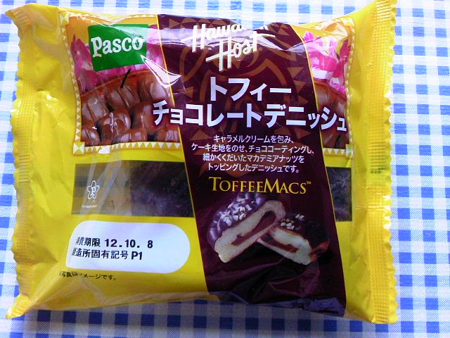 先日食べたPascoさんです Pasco トフィー チョコレートデニッシュ この製品はハワイアンホースト・ジャパン(株)の監修で敷島製パン(株)が 「マカデミアナッツトフィーマックス」の味をイメージして作ったデニッシュです 正方形のデニッシュをななめに切った断面です。 中にキャラメルクリームが入っており、チョココーティングされた生地にマカデミアナッツがトッピングされています。 キャラメルクリームはやや少なめな気がします 「マカデミアナッツトフィーマックス」を食べたことが無いので比べられませんが、 ちなみにこちら ハワイアンホースト トフィーマックス21g ※マカダミアナッツチョコレート ちょっとみた感じでは雰囲気違う気がするなぁ まぁ、菓子パンとしては美味しくいただきましたが、デニッシュは焼きたてサクサクだったらもっといいですよね~