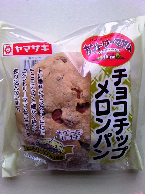 「カントリーマアム」使用? 。。。。と、またもや思わず買ってしまった。 ヤマザキさんのチョコチップメロンパンです。 上に乗せたビスケット生地にチョコチップと細かく砕いた「カントリーマアム」バニラを練りこんでいます。。。。。とのこと 中はチョコチップ入りのチョコ生地です。 袋をあけると、甘いカントリーマアムの香りが カントリーマアム~、カントリーマアム~、カントリーマアム・・・・・ 食べ進めていくうちに、中のチョコ生地の味におされれてしまったが、美味しかったです 上のビスケット生地をはがして食べたくなるようなメロンパンでした