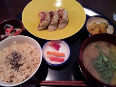 西荻窪にある玄米菜食の米の子でランチをいただきましたもちきび入り焼き餃子定食にミニデザートセットの玄米豆乳アイスクリーム・ショコラ+三年番茶で1350円でした