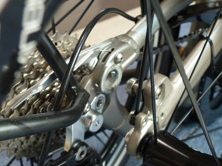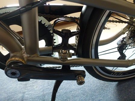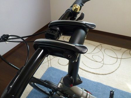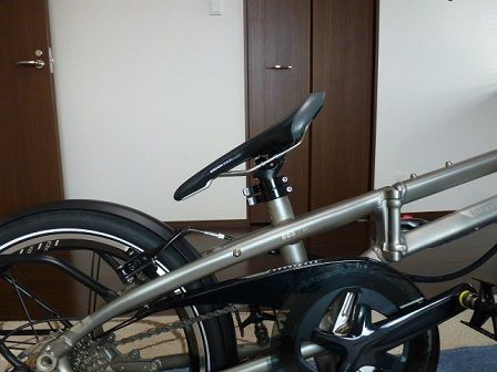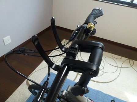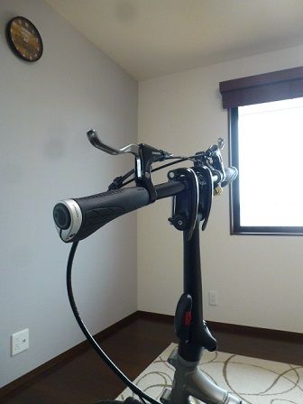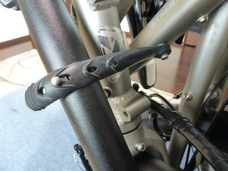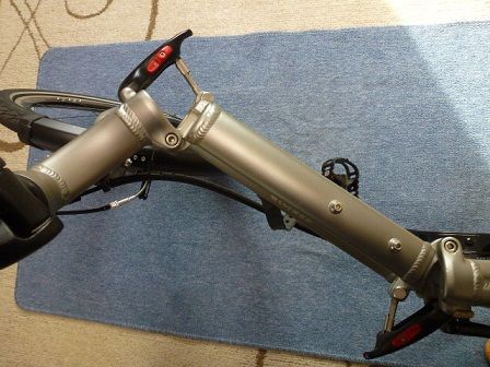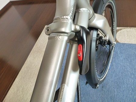 こんな状態です。これによりコンパクトになり輪行時も身体に当たったりしないので楽になりますね。