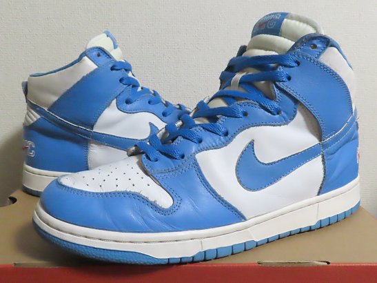 DUNK HIGH LE 630335-145 WHITE/CAROLINA BLUE-PIMENTO1999年春頃に国内ではNIKE SHOP限定で発売になったDUNK HIGH LE ”NYC”を購入しました。(※BOXは他のモデルの物を使用しています。)以前紹介したDUNK HIGH LE 630335-072同様、当時もNIKE SHOPで購入していていましたが、着用せずに手放してしまった経緯があります。しかし先日、まあまあの値段帯でクリーニングすればそれなりの状態になるだろうと思った物を見付けて購入してみる事にしました。それなりに状態は悪くないと思いますが、何時か箱付きデッドストックで見付けてたいものですね。一時のDUNKの流行りはもう無くなりましたが、こういったのってなかなか見付けるのが難しいですね…。
