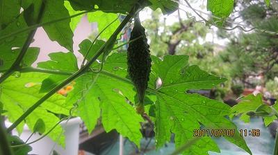雨の一日でした日除けにグリーンカーテンにゴーヤを植えましただんだんカーテンらしくなって来ました。今日第一号のゴーヤを見つけましたまだ6センチぐらいですがしっかりゴーヤの形をしています。ゴーヤは初めてです。なんだかわくわくします。