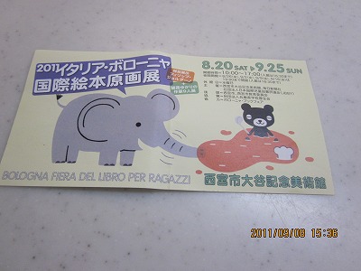 朝夕は少し涼しくなりました。今日は西宮市大谷記念美術館に行って来ました2011イタリアボローニア国際絵本原画展を鑑賞して来ました。沢山の人でした小さなお子さんずれの若いお母さんも多いでした子供の保育もありました。すてきな絵で説明もよくわかりました。少し早い秋の芸術鑑賞でした。