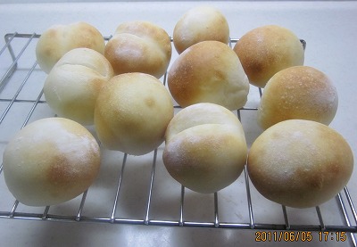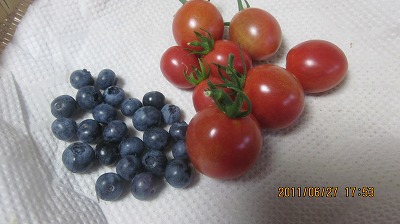 毎日蒸し暑いです屋上庭園で今年初めての収穫です。ミニトマト&ブルベリーです。 今日のパン白いふわふわパンです。