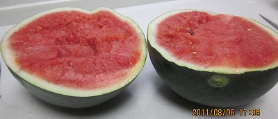 先日収穫したスイカですがテーブルから落としてしまいましたが二つ割りになりホッとしました。とても甘く美味しいスイカでした収穫時期もちょうどよかったようです。8日から孫達が仙台から帰って来ますのでよく冷やしておきます。