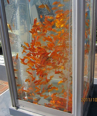 よいお天気に誘われて水都大阪フエス2011に行って来ました。よい香りが漂っているバラ園を見て来ました。子供達の遠足の姿もお弁当を広げていました。中でも人気があったのは昔の公衆電話を利用して何千匹もの金魚が泳いでいました。これは大学生の案で出来たオブジェだそうでした沢山の種類のバラのいい香りが風に乗ってすがすがしい空気でした。