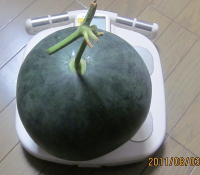 今年初めてスイカを植えました品種は黒皮スイカです。つるを上にあげてネットで受けていました。大きさは4.2キロありました未だ切ってないので中はどうだか分りませんが孫達が来るまで切らないで置きます。スイカは初めてでびっくりしています。