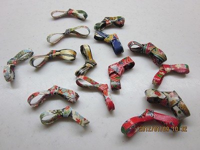 よいお天気で少し暖かく感じます今日は荷造り紐で箸置きを作りました紐に和紙を張り付け、結んでつやだしのニスを塗っています