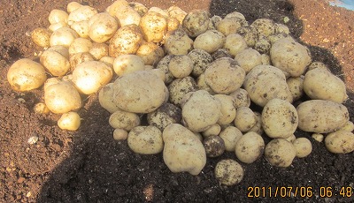 今日は屋上庭園でジャガイモ掘りをしました。種イモ1キロを植えたのですが収穫は12キロありました。沢山の収穫に驚きました。今年初めてスイカを植えたのですがだんだん大きくなって来ました今は3個のスイカが出来ていますが食べれるかしら??重くなるのでネットで支えています。