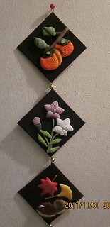 今日は午後から雨になりました。水やりがたすかります少し時間が出来るとさくらほりきりで買った手作りを楽しんでいます。三連タベストリー秋の彩り