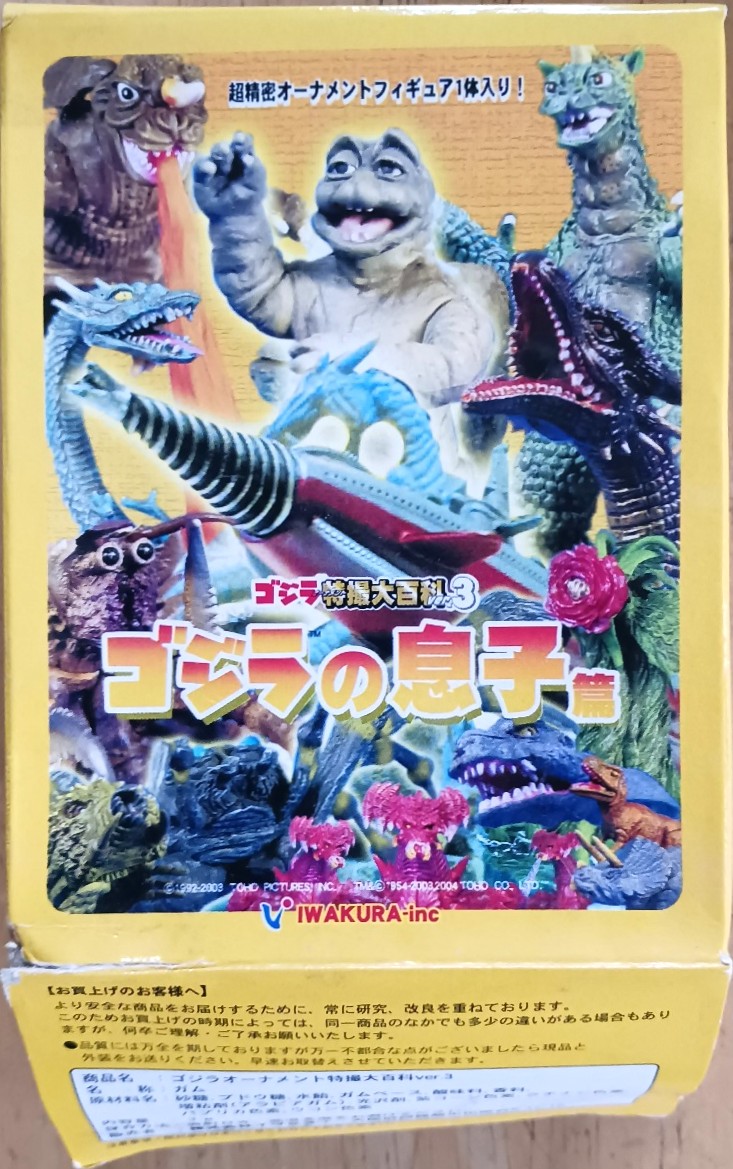 このシーズのver.3を取り上げるのは、初めてかと思います。 ちなみ、こちらは購入忘却品ですね。 プライスダウンのシールが無いようなので、ラッキーアイテムの「海底軍艦」が欲しくて、普通にコンビニで求めたのだと思います。 パッケージの裏側を見ると、ラインナップも、味わい深いのがそろっているのですが、デストロイア幼体の、彩色済ではないヴァージョンが出てきたわけです。 このシリーズは、クリアヴァージョンに代わって、この灰色のヴァージョンが登場したのだと思われます。デストロイアが登場する映画は、職域の劇場で見たわけですが、なんとも凶悪な面構えでしたね。