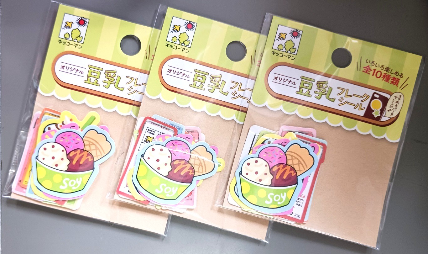 昨年、寝床から起き上がれなくなった、母に食事をさせようと、豆乳を求める事にしました。その時に売り場で見つけた品物。豆乳を数個求めると、特典として付いてくるようなお話でしたので、持ち帰りしたシールです。自社製品のパッケージを、そのままシールにするという、ほとんど経費のかかっていないオマケです。シールの大きさは、豆乳のパッケージの縦長が4cmです。こういうのは、どこに貼るというわけにもいかないので、とにかく貼れる場所に貼ればよいと考える、子供向けのシールですね。ただ、「キッコーマンの豆乳が人生のすべて」という方も中にはいるかも知れないので、そういう方にとっては、必須のモノかも知れないですね。