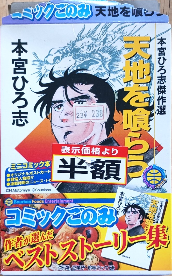 これは比較的解りやすいところに置いていたので、購入完全忘却品ではありません。 ただ、アップしようと撮影するまで、どのメーカーの食玩であるかは、スッカリ忘れておりました。 これは、ブルボンですね。 パッケージの下部を見ると、賞味期限が2004年1月5日となっていますので、2003年の商品ではないかと思います。コミックとお菓子をくっつけるという、珍しい試みに見えましたが、プライスダウン品で無ければ、買う事もなかったと思います。 これもまた、食玩全盛時代の証とも言える商品かも。