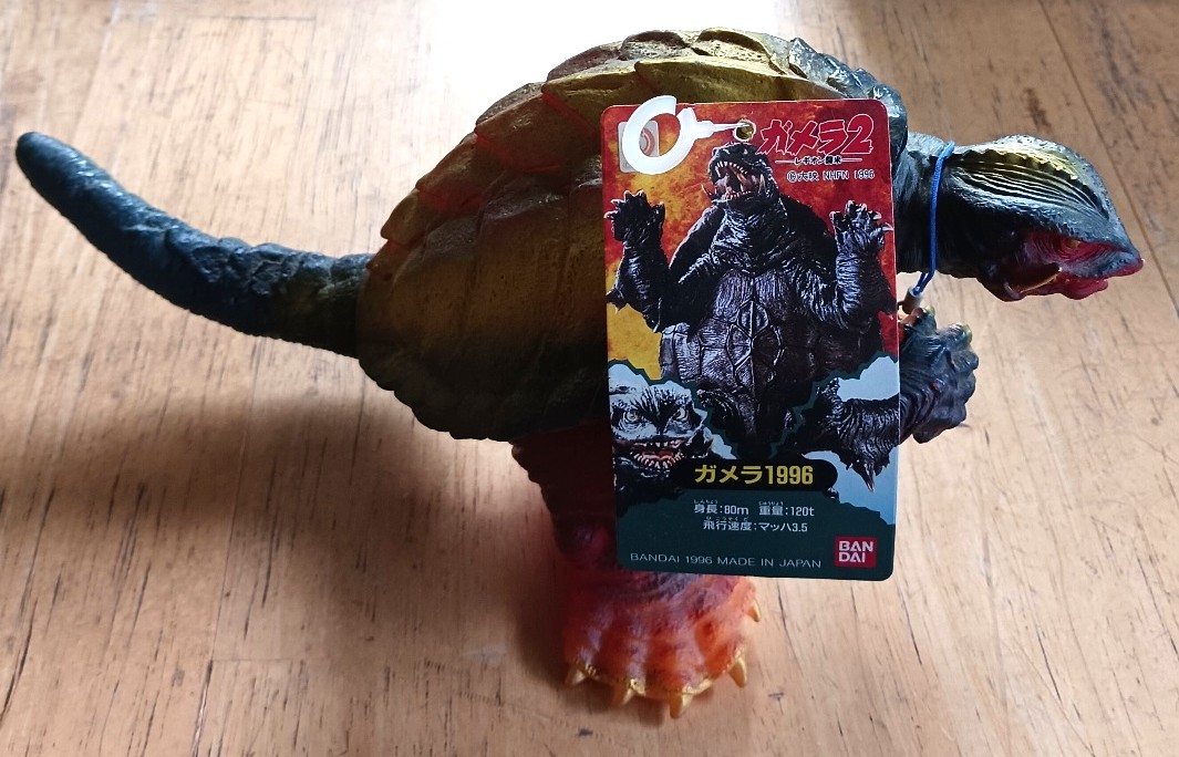 劇場公開時にパンフレットの巻末に掲載されていたので、通販で求めた品物です。「ガメラ2」公開時に、バンダイから発売されていた、「ガメラ1996」の塗装を、ウルティメットプラズマ発射前のような感じに、着色したモノを、劇場限定ヴァージョンとして発売していました。ちなみに、おもちゃ店の店頭で入手できる通常版のフィギュアは、躊躇しているうちに買い損ねました。現時点でおもちゃ販売の怪獣フィギュアコーナーに陳列してある、バンダイの怪獣製品と比して、かなりの大きさかと思われます。これを求めた時点においては、五桁数字の価格のガメラのフィギュアに手を出す事になろうとは、思ってもいませんでした。