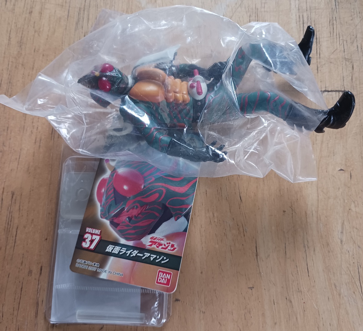 このフィギュアは、保管場所から一昨年あたりに発見しまして、見やすいところに置いておりました。たまたま先週末ぐらいに、「仮面ライダーアマゾン」にまつわる、おめでたいニュースが上がってきていましたので、月曜日にアップしようと準備をしていたわけです。28日(月)の昼休みに撮影まではしたのでしたが、町内会の用事で帰宅を急いだため、記事を書かずに勤務先を後にしました。しかも昨日は、勤務先がいきなり休日となりまして、出社をしておりませんでした。それで、本日となりました。まぁ、見る側にとっては、どうでも良い事ですけどね。2007年の製品のようですね。子供の頃の記憶で、アマゾンはトカゲであるという事が、少年誌に書いてあったように思います。それまでのライダーとは形状的にも一線を画していましたし、人気のほどはどの程度であったかもわかりませんが、このフィギュア自体はとてもカッコイイですね。