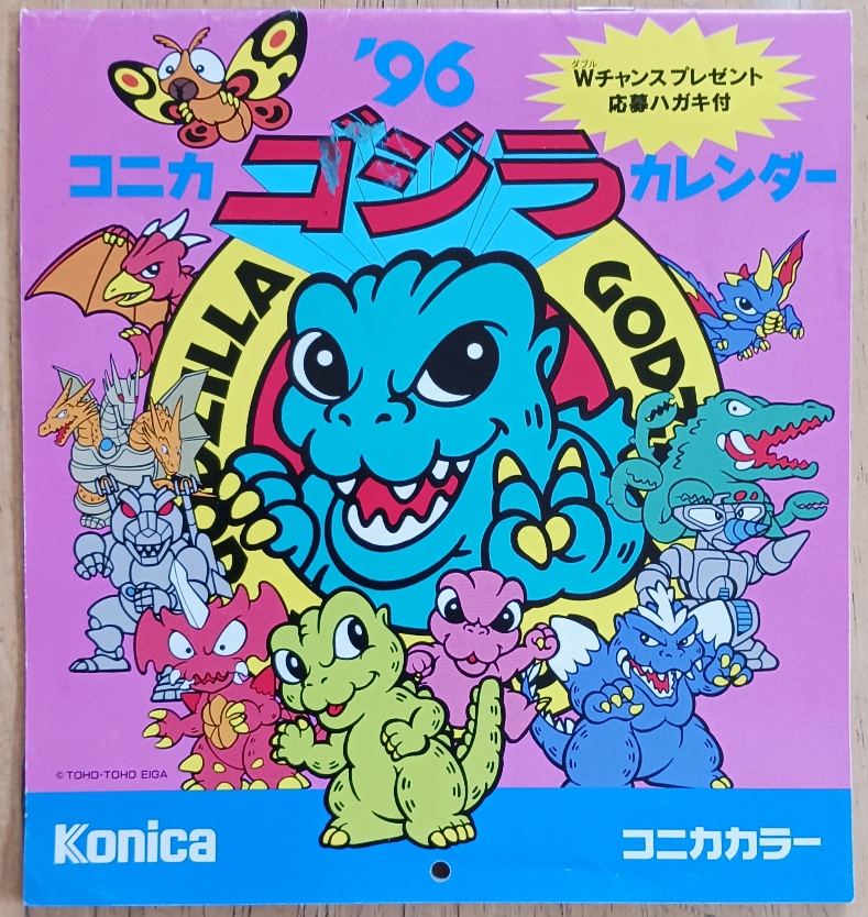 1995年の「ゴジラVSデストロイア」上映開始前ぐらいに、制作されたカレンダーです。閉じている時の大きさは15cm×15cmぐらいで、シングルレコードのジャケットよりやや小さめな感じ。映画上映前という事もあって、あえて写真等は使用せずに、デストロイアを入れる必要があったためか、全編、ディフォルメのイラストによるカレンダーになっています。こういうのは、特撮好きの視点だと、写真店で顧客サービスのモノとして頂戴できるから、ディフォルメのイラストでも許されるのであって、お金を出して買うようなタイプのモノではないとは思います。ただ、一部の怪獣等は、こんな感じのイラストで描かれる事もあまり無かったと思うので、ここで取り上げた、ビオランテとか、バトラとかのイラストは、当時、興味深く見たような記憶がありますね。ビオランテもバトラも、とにかく夜出てきて、暗い所で戦っているというのもあり、特にビオランテは形状がよく解らなかったので、とても関心がありました。「ゴジラVSビオランテ」は有楽町のマリオンで、昨年亡くなった親友の奥様と一緒に鑑賞しました。確かデーモン閣下が出ていましたね。鑑賞後、学生時代からの仲間数名と、六本木の中華料理店で食事をしたのは覚えています。まだ、私も20代でした。「ゴジラVSデストロイア」は、今の職域の劇場で鑑賞しましたが、その劇場は既に無くなっています。