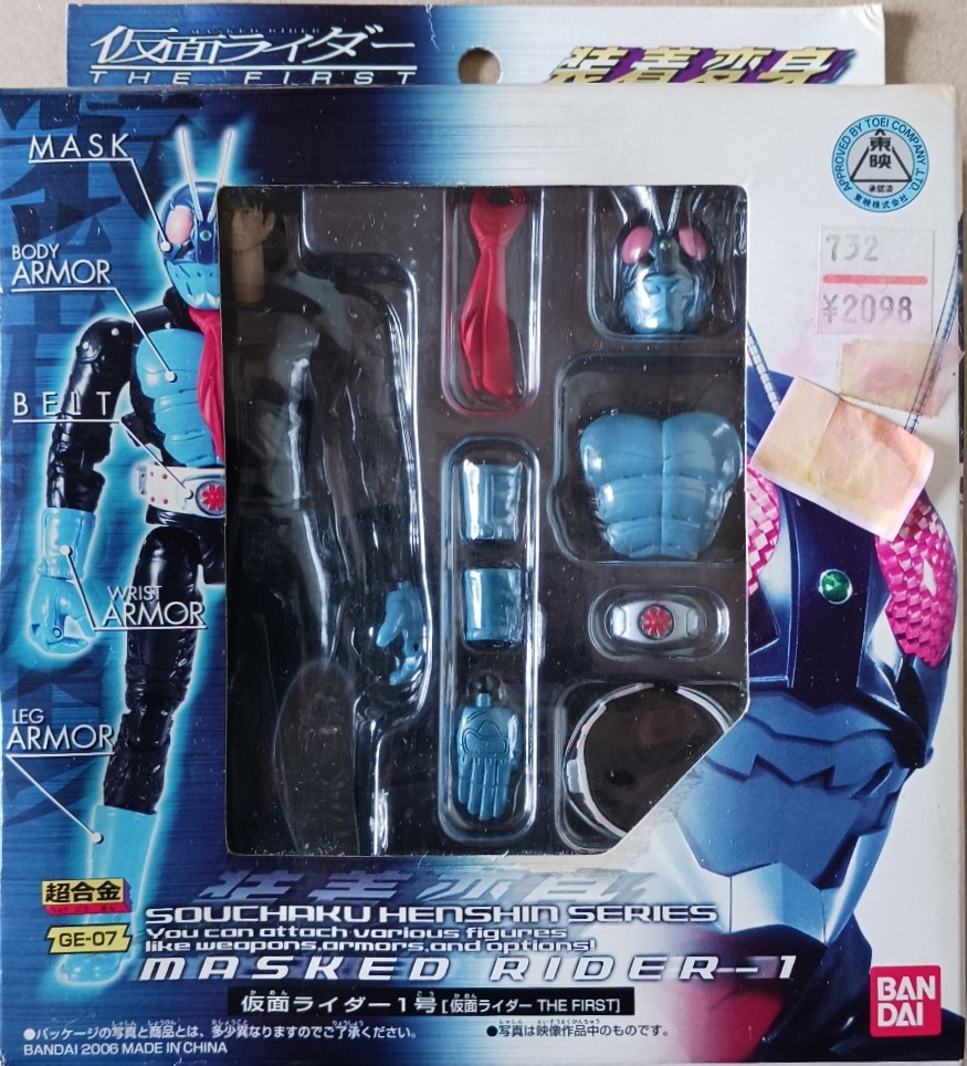 これも、ほぼ、入手忘却品でした。 プライスダウンの価格が、湿気で取れかかっておりましたが、今回の撮影時取れましたね。 半額で求めたと思います。 正直、ロボット以外の可動フィギュアは、好きではないのですが、半額のお買い得感と、青みがかった仮面ライダー旧一号色が大好きなので、迷わず入手したのだと思います。このファーストは、オリジナルの旧1号のフェイスが比較的丸いのに、面長な感じですね。