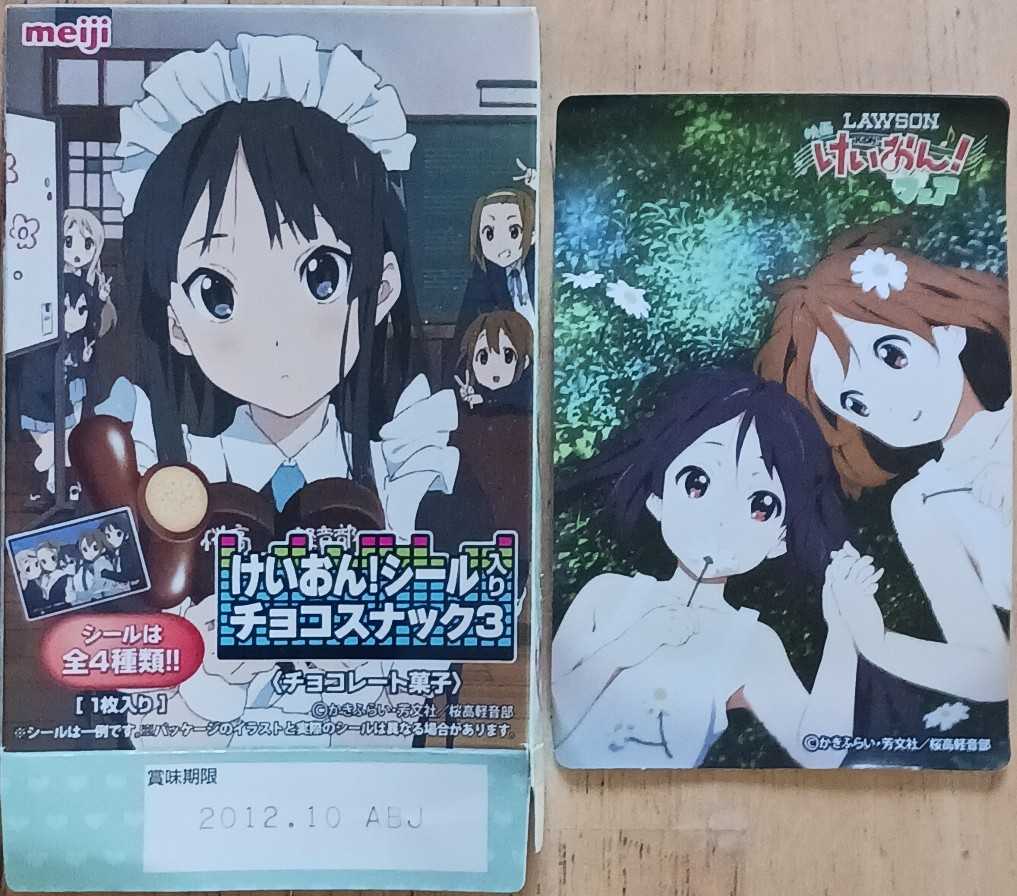 購入忘却品。 パッケージの中にシールが入った状態で出現しました。シールの右上の方にLAWSONの文字が見えるので、映画上映時に企画された、明治のお菓子とLAWSONのタイアップ商品のようです。 お菓子の賞味期限が2012年10月になっていますので、10年以上経過したという事ですね。 シールの種類がわずか4種類というのは、お金をつぎ込めるのであれば、コンプリートがしやすいのかも知れません。 とくに「けいおん」のファンというわけではないのですが、折に触れて目にしていたのと、ガムではなくてチョコレート菓子だったのと、キャラクターの絵も好きだったので買ってみたのだと思います。