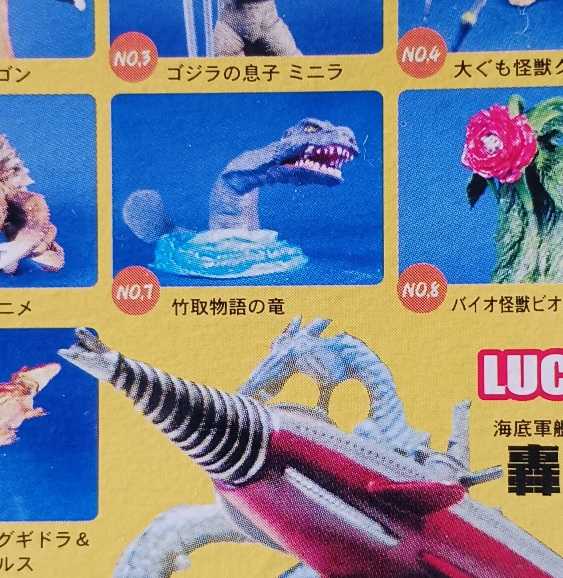 「竹取物語」という特撮作品に関して、脳裡の片隅にすら無かった事もあり、私の知らない60年代の古い映画かと思っていました。 解説用紙を読んで、1987年の映画だった事を知りました。 社会人になった年の翌年なので、最低限の趣味以外の事は、全く余裕が無かった年でもあります。 説明用紙のこのポスターは、当時、住んでいたところで、見たような覚えがありますね。 このフィギュアは、「竜」という事になっていますが、角とか髭とかがなくて、尻尾がウナギみたいな形状になっています。ひょっとしたら、足とかは、水中にあって見えないだけかも知れない。