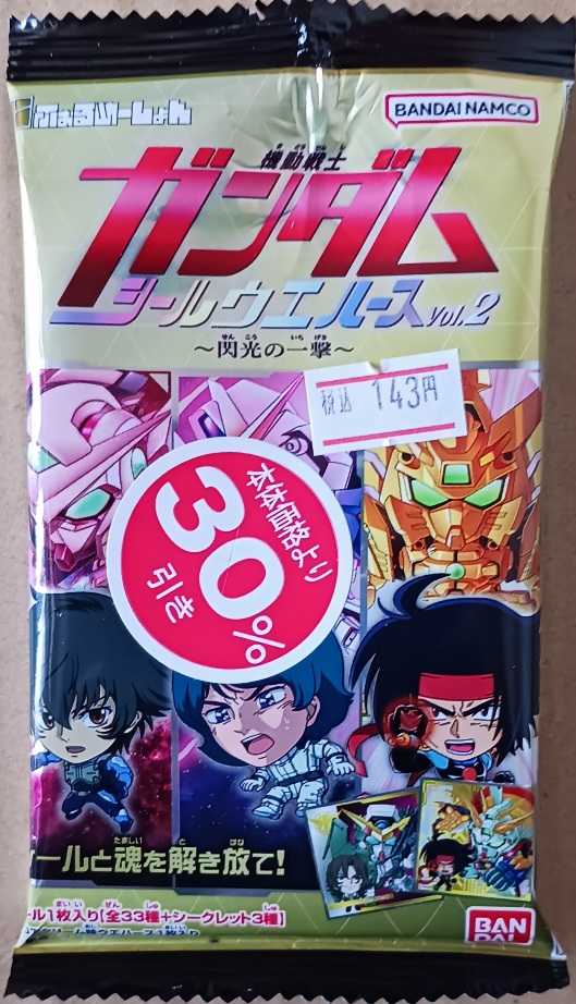 居住地のドラッグストアで見つけた、プライスダウン品。 ラインナップをざっと見ると、 半分以上は知らないので、 私の知っているガンダムが出てくれたら、 ありがたいと思っていた。出てきましたね。こういうのは、 そんなに欲しいというわけではありませんが、 知っているガンダムが入っているとなると、 長年の習性が抜けません。あと、 フィギュアと違って、 空間占拠がわずかなので、 収納の心配がない。