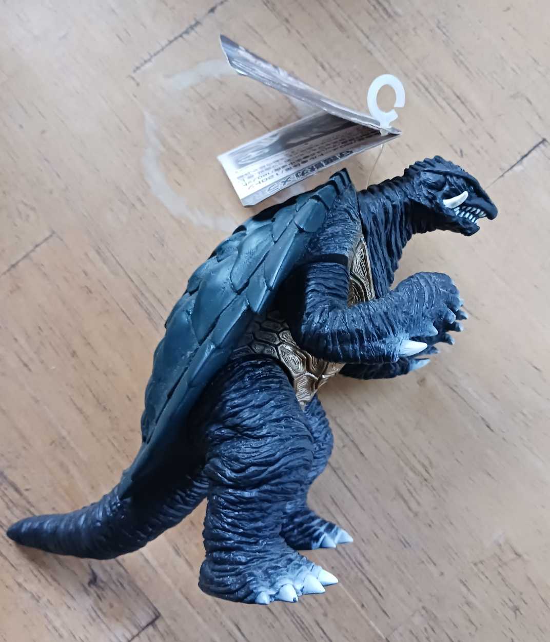 以前にも書きましたが、「ガメラ2」上映時は、 取り上げている雑誌とかは収集していたのですが、 フィギュアを集めようとする考えは、 ほとんどありませんでした。 食玩とかは求めたのですけど。 その反省(?)も踏まえて、 「ガメラ3」の時は、 特別に高額なフィギュア以外は、 買い集めました。 そのうちの1つです。 顔が怖いのが特徴の一つですね。 あと目が緑色をしています。お腹は金色を施しています。 劇中で炎に照らされると、 こんな感じで輝くのかも知れません。