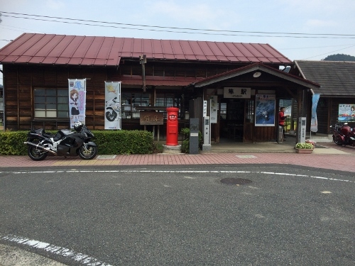 '15ツアー Rd08 鳥取若桜鉄道の旅(その3)です。砂の美術館を後にして若桜駅のSLを目指します。途中若桜鉄道「隼」駅に寄りました。ここはスズキの「隼」と同じ駅名のため、「隼」乗りの聖地となっています。8月の第二日曜日に「隼駅祭り」が開催され500台を超える隼が集合します。今日も2台の隼が来駅していました。ちなみに、今日の三人はスズキ車すらいません(笑)次は、お隣の安部駅に寄りますよ。安部駅着。国の登録有形文化財であるとともに、寅さん「寅次郎の告白」のロケ地にもなりました。ホームの待合には寅さんがいました(笑)若桜駅へ移動。昼食場所の「ダイニング新」は、団体貸切になっていたため、団体が出るまで、先に若桜観光に回ります。いきなり怪しい店舗発見「昭和おもちゃ館」とあります。中は駄菓子屋ですが・・・。ここから先は有料とあります。100%興味本位で入場します。昔の茶の間が再現されてます。えっ?これだけ?2Fがあります。上がってみましょう。2Fはブリキのおもちゃのコレクションが並んでいます。奥には月光仮面がいました。等身大です(笑)他にも懐かしい人形が並んでます。若桜鉄道の鉄道模型のジオラマがあります。ちゃんとしたNゲージです。台の下に電源スイッチとコントローラーがあって動きます!若桜駅です。本日の目玉の3つ目のSLと回転台があります。入場券(¥300円)を買って中に入ります。構内に入らなければ、SLを間近に見ることはできません。新旧機関車の対決?です。C12機関車。ちょっと小ぶりでレトロです。これって若桜鉄道がレストアしたんですって。しかも、蒸気機関→圧縮空気駆動に変換されているそうです。石炭と水じゃなくて、空気で走るんだそうです。すげ~エコ。さすがに実動するSL。可動部分の手入れが行き届いてます。このメカメカしさが、萌え萌えです。よそで展示されているSLは、この辺の部品が錆びてたり、塗装で真っ黒だったりするので、この真鍮カラーがとても新鮮です!そして、転車台。そもそもこの転車台を個人でレストアしたことをきっかけにSL保存会が発足して?、その後SLを譲り受けたって、転車台が先だったって事?第二、第四日曜日には蒸気機関車の展示運転と転車台体験がでるんだって!惜しかった!今日はないわ。ちなみに、この転車台。動力は人力です。下におりて、人間さんが押すみたいです。団体さんが終わる時間が来たので、再び「ダイニング新」へhttp://kanko.town.wakasa.tottori.jp/search/eat/arata/古民家を改装しています。なつかしい佇まいです。豚重¥1200+大盛+¥200をチョイス。食べ応え充分!お重ですから、この飯の下にも豚が引いてあります。さすが養豚農家直送。すげえ~うめえ!お土産は弁天饅頭。これも、甘すぎずやわらかくておいしい。豚重を食べている間に頼んでいたら、お勘定のときに出来てました。この後、大原のcafeで休憩して帰路に着く予定でしたが、ネットで雨雲検索したら、岡山はもう既に雨が降っている模様。30分もしたらこっちも雨になりそうです。ここで切り上げて、帰路に着きます。予定を変更して、鳥取方面へ戻って河原ICから鳥取道で帰ります。これが、大正解。すごいいい道であっという間に河原ICへアクセス。この時点で、雨が降り始めました。津山組の2台は智頭ICで下車R53を南下します。僕はそのまま大原ICまで乗って、大原→美作→R374で帰りました。結局雨脚はさほどでもなく、途中何回か濡れましたが、ビショビショって感じにはなりませんでした。津山組もカッパを着ることなく帰宅できた模様です。僕がカッパを持っていっていなかったんで、急遽切り上げさせてもらってすみませんでした。気候も良くなってきたし、上半期の遅れを取り戻したいんで、9月は複数回、開催したいですね。