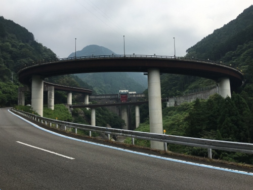 渋滞のR11号をトロトロ渋滞をすり抜けて、三豊ICから高速に乗って、更に西へ・・・。新居浜IC下車。さらに県道47号を南下します。鹿森ダム通過。ダム+ループ橋って萌える~新道のぶち抜きトンネルをたくさん抜けて、このわかりにくい、分かれ道を左折します。そう、これから東洋のマチュピチュ。東平(とうなる)を目指します。途中の山の斜面。これなんじゃ?昔の戦争映画の、兵隊の墓標みたい。多分、植林した苗木の鳥獣被害対策カバーかな?以前似たような、鹿の食害対策用のものを見たことがある。1本いい値段するから、これだけ使うと結構な金額になるなあ~東平までは、結構狭いワインディングなんだけど、最近は観光地化されてて、バスが無理やり上がって来る。当然、離合できなくて上下の待避所までバックすることになるんだけど、バスが前からきたら当然こっちがバックすることになるわな。こっちはバイクだから平気なんだけど、その前のヴィッツがバックに手間どって、上が大渋滞。彼氏にチェンジしても、彼氏も慣れてなくて、更に大渋滞。ワインディングだから谷の向こう側に渋滞が伸びていっているのが、目の前に見えてスゲープレシャー。こっちは汗だくだから運転代わってあげようかとも言えず、邪魔になるのも悪いので、先に下の待避所まで下って待ってた。待てどもヴィッツは来ない。離合できたのかな?って上がろうとしたら、やっとこさ降りてきた。ヴィッツ後ろのバンパーの角へこんでた・・・。彼女は笑っていましたが・・・。まあ、四国の山道では、よく見る光景ですね(笑)先に東平に到着。ヴィッツも後から上がってきました。この東平ですが、以前に来たことあります。昔の日記その時は諸般の事情で、このインクライン跡を降りれなかったので、今回リベンジです。220段のインクライン跡階段を下ります。まずは下から!とりあえず下へ!ちなみに、インクラインってケーブルカーの呼称は通常旅客営業を目的とする鋼索鉄道に対して用いられるが、産業用に建設された鋼索鉄道(つまり貨物用ケーブルカー)を、通常インクライン(英語:incline、傾斜(鉄道))と称する。山岳地帯での材木の輸送、ダム工事現場での資機材の輸送などに多用される。下ってみたら、いきなり廃墟登場!東平貯鉱庫跡。写真じゃわかりにくいけど、巨大です。ん?なんか看板?「マムシ注意」!!歩道部以外歩くなって!!一段上に上がってきたけど、ここも黄色い注意看板あり!う~ん。いい感じ。やっぱり廃墟は下から見上げる感じが最高やね。索道基地跡マムシに注意しながら、うろうろ。220段降りてきたんだから、上がんなくちゃ100段200段(笑)紫陽花が綺麗です。先月わざわざ紫陽花見に行って不発だったのが頭をよぎります。上からはこんな感じ。やっぱり下まで降りて見て正解。ここは、このインクライン跡+貯鉱庫・索道場跡だけではなく、旧鉱山施設(廃墟)が点在しています。奥の施設は、前回くまなく回っているので、これで良しにします。下の道の駅まで下って、お土産買って帰ります。今17時なんで、晩御飯までには帰れるでしょう。今日のお土産はレモンケーキとポンジュースグミ。グミはVツインのリアバンクの熱風でハート型が解けてなくなってました(笑)本日は354Kmのぶらっとプチツーでした。
