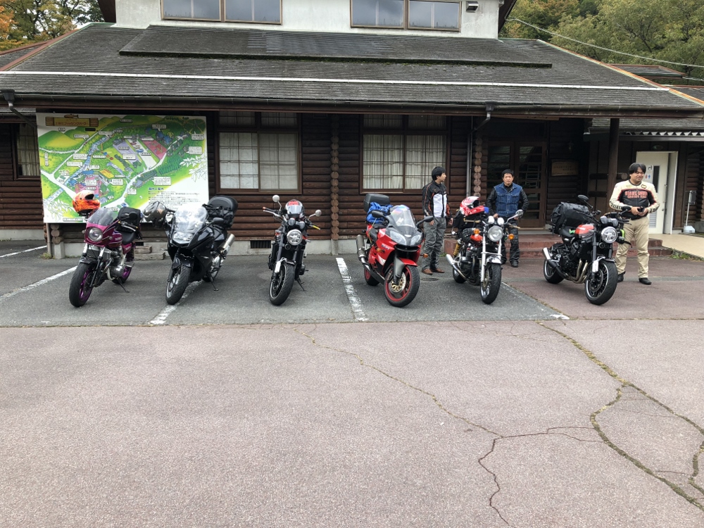 さて、2日目。朝6時起床。温泉入って、朝ごはん食べて、まったり休憩をはさんで、さて出発。このゆっくり感。前泊サイコー!これが、屋根付き駐輪場。まだカッパは乾いてないな・・・。グローブは冷たいまんま・・・。さて、出発。幹事との待ち合わせ場所到着。幹事は30分ほど遅れるとのこと。ひと眠りしますか(笑)きっちり30分遅れで、幹事到着。幹事には連れがいます。ここでの合流は幹事だけのはず。こっちの友人でしょうか?見たことあるバイクですが・・・。同じバイクに乗ってる人は千葉の人なんで、ここにいるはずはないしね。阿蘇まで来ました。第二集合場所の三愛レストハウスへ。ここで、広島組と合流。これで広島・岡山・福岡・東京と全員集合。いえいえ、もう一台。野田ナンバーの9Rがいるのですよ。千葉から36時間のフェリーの旅を経て参加してる「あの人」が!酒の神降臨私のリクエストで、阿蘇火口へ。前回は時間がなくって、行けなかった火口。その前は、噴火による規制で近づけなかったし。火口の周りは別世界。植物は何にも生えてないし、噴石と土砂に覆われて死の世界。火口影響ラインで自然界がクッキリ違う。火口へ行ってみましょう。さて・・・。うむむむ・・・む・・・だめだ、ガスって火口は見えない。モクモク出てるのはわかるけど。モクモクしか見えない。もう一つ高い場所にある展望台へ行ってみましょう。振り返ると、ロープウエイ乗り場が、噴石でボコボコにやられています。穴だらけ・・・。さて、どうだ!やっぱり、ダメー!下界へ降りてきました。下界からも自然界の境目が分かります。ここから、幹事が凄かった・・・。怒涛の阿蘇RUN!!幹事曰く「せっかくバイクで阿蘇に来たんなら走らにゃ損損!阿蘇グルメなんて時間がもったいない。グルメは車で来た時ね!」ってパノラマライン後半~長陽大橋を経由してケニーロードへ最遠のケニーロードを走破。ここから再度北上します。道の駅 あそ望の郷くぎので昼食。幹事は革ジャンオンリーで寒くないの??昼食は「赤牛食わせろ!」ってリクエストしてたんで、もち赤牛メニュー。赤牛丼をチョイス。この後も怒涛の阿蘇RUN!!は、更に続きました・・・。阿蘇南部広域農道~林道阿蘇東部線~やまなみ~ミルクロード~菊池阿蘇スカで上津江フィッシングパークへここで香川組と合流。計6台になりました。今日の宿はこのバンガロー。中はロフト形式の中二階になってます。バーベキューの食材を菊池温泉まで買いに行って、さて宴会です。(昨日の宿とこんなに近かったのね(笑))カンパーイ!バカ話+バイクネタで大いに盛り上がりました。明日は帰らなあかんのですよね・・・。