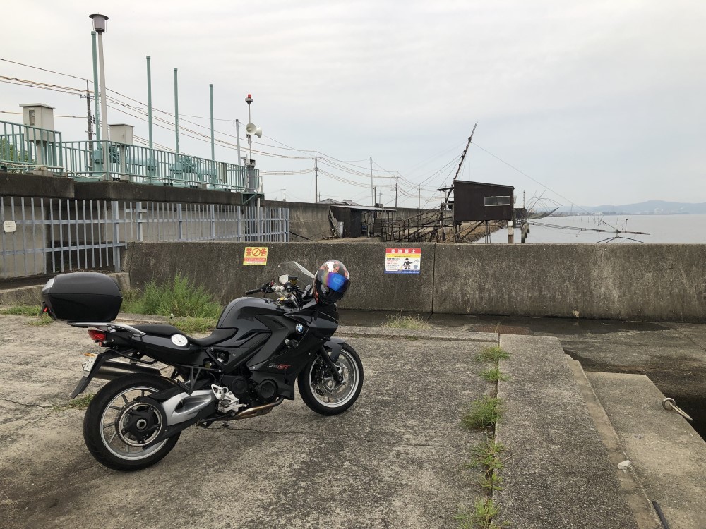 ちょっと隙間時間ができたから、F8引っ張り出して、ちょっと海まで流してきました。家から百間川の堤防道路を海まで下って、九蟠港へ九蟠では四手網漁が盛んでした。四つ手網とは約5~6m四方の網が設置された小屋で、巨大網を使って魚を獲る漁のスタイル。今は観光漁業として、小屋に1泊して、魚を取りながら一晩飲み明かす大人の遊び場になってます夕方から翌日のお昼頃まで小屋に滞在。夜の暗闇の中、部屋の明かりに誘われて寄ってきた魚たちを巨大網ですくい上げます。1棟1泊で10,000円くらい。5~10人程度は小屋に泊まれるから、人数割りすればリーズナブルな金額で遊べます時期によりますが、ベイカ・エビ・ママカリ・カニ類などを堪能できます。小屋には調理台、冷蔵庫、鍋、食器などが揃っているので獲れたての魚をすぐに調理して食べられます。釣果を期待せず、肉や野菜を持ち込んでBBQや鍋をしながら、とれた魚を料理に加えるのがオーソドックスなやり方です平成16年の16号台風の高潮被害で、この児島湾の海岸線は大きな被害を受け、当時60件以上あった小屋も、今は20数件にまで減ってしまっています。この海から生えた足は、当時の小屋の跡なんです。昔はこの海岸線の向こう端まで小屋が並んでいて、シーズンの夜になると、小屋の明かりが海岸線に続いて並んでいて、その景色は風光明媚だったんですケドね。私も、社会人になりたてのころ先輩たちに連れてきてもらったことがあったなあ~。