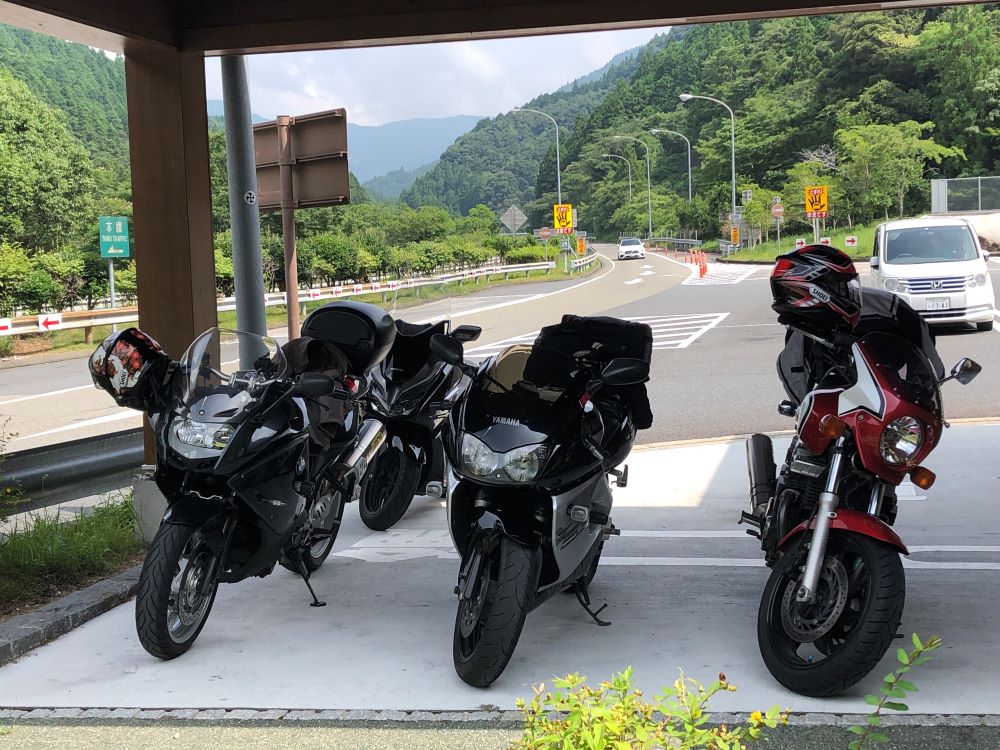 '22ツーRd07 開催しました。今回は高知の「にこ淵」に涼を求めて行ってきました。参加は4台。サンダーエースCB750フォルツアF8の4台です。8:20 瀬戸中央自動車道鴻ノ池PA到着すでに他の3台は到着済み。今回フォルツアさんは初参加なので、全員軽く自己紹介をして出発です。今日お昼ご飯の予定をしていた、蕎麦屋の「時屋」さんに予約の電話をしたところ、本日予約で既に満席とのこと。残念。瀬戸大橋を渡って、高松道から高知道に渡って、立川PAで休憩。今日も暑っちいので、1時間に1回は強制的に休憩を入れて行きます。大豊ICで高知道を下車して、R439を西進して、四国の水瓶である早明浦ダムへ。<早明浦ダム>河川名 吉野川水系吉野川集水面積 472.0km2(江見川収水55km2含む)地質 石英石墨片岩型式 直線重力式コンクリートダム堤高 106.0m堤頂長 400.0m堤体積 1,187,000m3堤頂幅 6.0m湛水面積 7.5km2貯水池延長 19.0km洪水時満水位 EL343.0m平常時最高水位 EL330.2m洪水貯留準備水位 EL328.5m最低水位 EL275.0mダム天端 EL345.0m総貯水容量 316,000,000m3選択取水設備 型式 鋼製三段式半円形ローラーゲート利水放流設備 型式 ホロージェットバルブ 門数 φ2,000mm×2条 流量 177m3/s(2門) 位置 中心EL262.0m洪水調節設備 型式 ローラーゲート 門数 6門 位置 敷高EL325.0m ゲート高18.8m×幅10.4m堤体天端に上がってみましょう。上の展望台へ上がってきました。ここはヘリポートも兼ねてました。早明浦ダムは昭和50年(1975)に完成し、吉野川の洪水調節を担うとともに、年間約8億6300万m3の用水を新たに開発して四国4県に送っています。堤体へ降りてみましょう。早明浦ダムを中核とする吉野川総合開発 の実現によって、吉野川水系全体の水が四国4県で総合的に有効利用できるようになり、吉野川水系の水資源に依存している地域は、 南部を除いた徳島県のほぼ全域、香川用水による香川県のほぼ全域、愛媛分水による愛媛県四国中央市、高知分水による高知市などに及んでいます。 四国4県の利水に加えて、建設後 40年間で102 回の洪水調節を行うなど治水に果たす役割も極めて大きく、四国の市民生活、産業活動に多大な影響を持つ早明浦ダムは、「四国のいのち」と呼ばれ、その名が刻まれた碑がダム右岸公園に建っています。平成30年度から令和10年度までの予定で行う、早明浦ダム再生事業は、貯水池の容量振替や予備放流方式の導入により洪水調節容量を増大させるとともに、洪水時の放流能力増強のため放流設備の増設等を行うことにより、ダムの治水機能の向上を図ることを目的としているそうです。右岸側に放流設備の増設等を行うことを計画しているようですね。だから、右岸側に新たな工事用道路とか、資材ヤードが出来ていたんですね。再生事業の本堤工事が始まったら、今日みたいにダム天端には上げてもらえなくないそうですね。貯水率は56.7%まで回復しました。これではダム湖に水没している旧大川村役場の屋根等は姿を現していませんね。なので、ダム湖沿いルートで旧大川村役場へ行く予定はオミットですね。近くの道の駅で給水休憩。みんなスマホが熱暴走しています。写真は撮れんわ、ペイペイ払いが出来んわアイスやジュースでスマホを強制冷却してました私F8とサンダーエースが、今晩予定があるのと、今回が日曜開催という事もあって、早期帰宅スケジュールで行程を組み直します。この後は、にこ淵→木之香温泉で昼食→寒風山トンネル→いよ西条ICで帰路の行程とします。さすが高知。高知家と海洋堂とのコラボ自販機がありました。もちろん高知発出の有名人のフィギアのカプセルの商品も入ってました。でっかいガチャガチャって事ですね。高知家は、2013年に高知県知事が発表した、「高知県はひとつの大家族やき」をキャッチフレーズとし、高知県全体を「家」と表現したもので、このキャッチフレーズも10年を迎えています。海洋堂は、模型業界では、高い造形技術と型破りな経営で有名な企業で、造形物の精巧さや造形センスは世界屈指の水準を誇っています。創業者が高知県出身で高知県四万十町に廃校舎を再利用した博物館「海洋堂ホビー館四万十」を開館させています。初期のチョコエッグのオマケは海洋堂の仕事ですね。R439を西進してR194に乗り換えて北上します。R194から少し入って、「にこ淵」到着です。R194から分岐には看板がありますが、知らないと見逃しちゃいそうです。「にこ淵」の奥にある「程野の滝」の看板を目印にした方がいいかもしれませんね。にこ淵は仁淀川の支流にあたる「枝川川」にあります。近年「仁淀ブルー」という言葉が広がるとともに、美しく幻想的なブルーが見られる場所として四国を代表する観光スポットになりました。太陽の光が注ぐ時間や季節による光の角度によって変化する幻想的な青の世界を見ることができます。1年を通して同じ青は見られないと言われるほど、様々な青を見ることができます。今日は先日からの降雨で水量が多いのか、滝の水勢が強いですね。水勢が